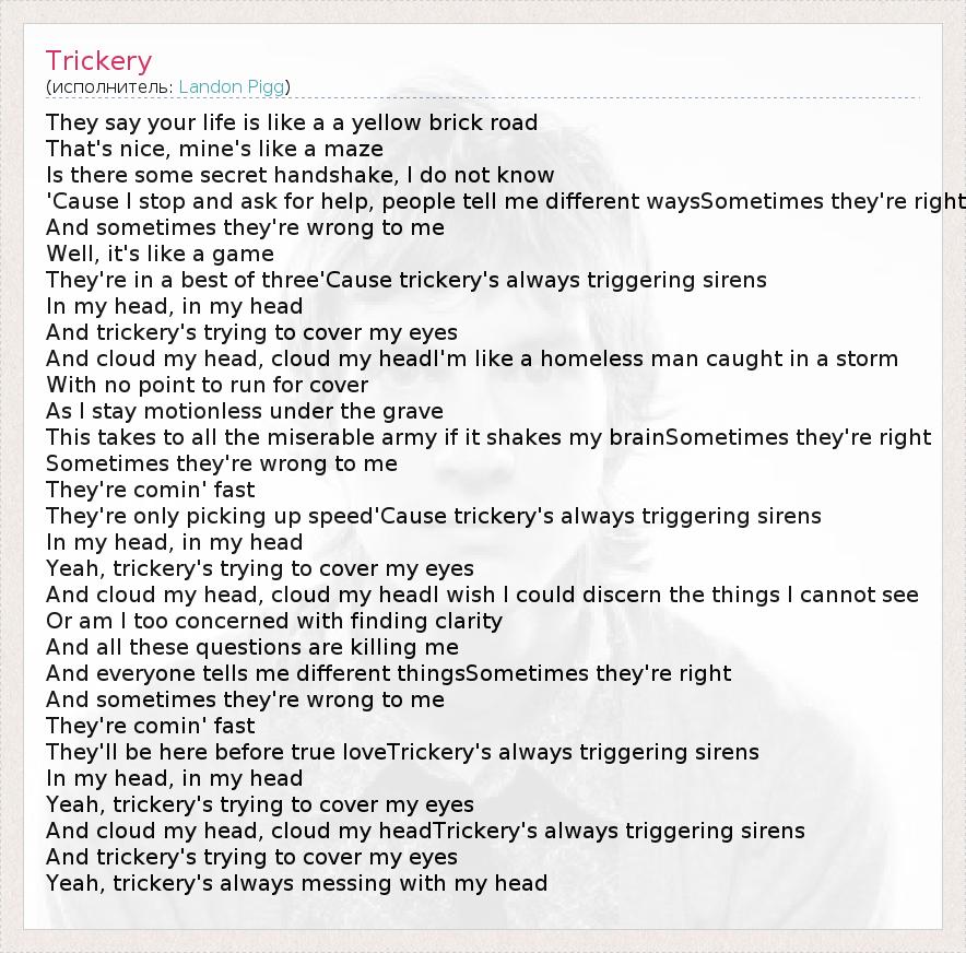 They say your life is like a a yellow brick road That's nice, mine's like a maze Is there some secret handshake, I do not know 'Cause I stop and ask for help, people tell me different waysSometimes they're right And sometimes they're wrong to me Well, it's like a game They're in a best of three'Cause trickery's always triggering sirens In my head, in my head And trickery's trying to cover my eyes And cloud my head, cloud my headI'm like a homeless man caught in a storm With no point to run for cover As I stay motionless under the grave This takes to all the miserable army if it shakes my brainSometimes they're right Sometimes they're wrong to me They're comin' fast They're only picking up speed'Cause trickery's always triggering sirens In my head, in my head Yeah, trickery's trying to cover my eyes And cloud my head, cloud my headI wish I could discern the things I cannot see Or am I too concerned with finding clarity And all these questions are killing me And everyone tells me different thingsSometimes they're right And sometimes they're wrong to me They're comin' fast They'll be here before true loveTrickery's always triggering sirens In my head, in my head Yeah, trickery's trying to cover my eyes And cloud my head, cloud my headTrickery's always triggering sirens And trickery's trying to cover my eyes Yeah, trickery's always messing with my head
