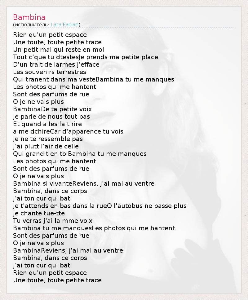 Bambina (итал. Малышка) — мелодию припева этой песни сочинила Jane Clewer, которая уже сотрудничала с Ларой (песня Je T’appartiens c Pure). Музыка похожа на колыбельную. Текст песни, по словам Лары Фабиан посвящен бабушке и матери певицы. На последнем концерте в Москве в 2008 году Лара посвятила эту композицию своей дочери. На песню был снят клип, в котором Лара пела ее под аккомпанемент гитариста Жан-Феликса Лаллана (ставшего продюсером альбома Лары Фабиан Neuf (9).