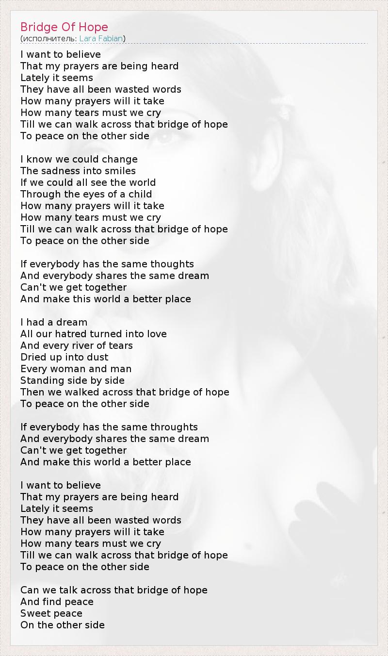 Хочется верить, Что мои молитвы слышат, Последнее время мне кажется, Что все слова улетели на ветер, Как много потребуется молитв, Сколько слез мы должны выплакать Прежде, чем мы сможем пройти по мосту надежды К миру на другой его стороне... Я знаю, мы можем поменять Грусть на улыбки, Если сможем увидеть мир Глазами ребенка... Как много потребуется молитв, Сколько слез мы должны выплакать Прежде, чем мы сможем пройти по мосту надежды К миру на другой его стороне... Если все думают об одном И каждый разделяет эту же мечту, Разве мы не можем собраться вместе И сделать мир лучше? Я мечтала, Чтобы вся наша ненависть стала любовью, А каждая река слез Высохла в пыль, Все мужчины и женщины Встали рядом, И затем мы пошли по мосту надежды К миру на другой его стороне... Если все думают об одном И каждый разделяет эту же мечту, Разве мы не можем собраться вместе И сделать мир лучше? Хочется верить, Что мои молитвы слышат, Последнее время мне кажется, Что все слова улетели на ветер, Как много потребуется молитв, Сколько слез мы должны выплакать Прежде, чем мы сможем пройти по мосту надежды К миру на другой его стороне... Можем ли мы поговорить на мосту надежды И найти мир, Сладкий мир На другой стороне...
