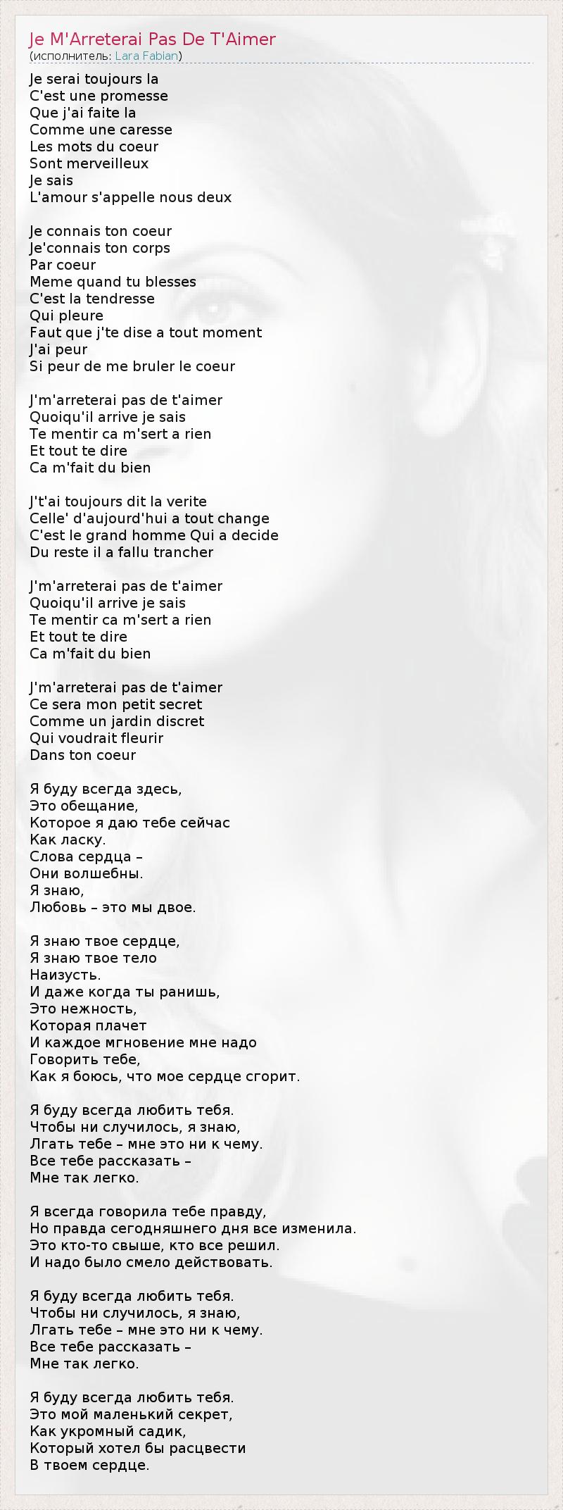 А как ты думаешь, о чем песня "Je M'Arreterai Pas De T'Aimer" ?