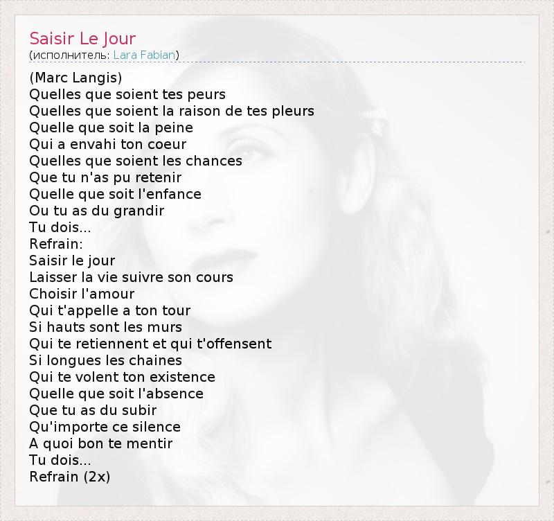 (Marc Langis) Quelles que soient tes peurs Quelles que soient la raison de tes pleurs Quelle que soit la peine Qui a envahi ton coeur Quelles que soient les chances Que tu n'as pu retenir Quelle que soit l'enfance Ou tu as du grandir Tu dois... Refrain: Saisir le jour Laisser la vie suivre son cours Choisir l'amour Qui t'appelle a ton tour Si hauts sont les murs Qui te retiennent et qui t'offensent Si longues les chaines Qui te volent ton existence Quelle que soit l'absence Que tu as du subir Qu'importe ce silence A quoi bon te mentir Tu dois... Refrain (2x)
