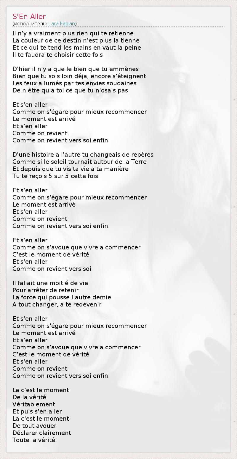Тебя больше действительно ничто не держит, Цвет этой судьбы больше не твой, Стоило труда протянуть тебе руки, На этот раз ты должен будешь выбрать Ты уносишь с собой вчерашнюю радость, Хоть ты уже далеко, гаснут Огни, зажженные твоими внезапными желаниями, Чтоб тебе принадлежало и то, на что ты не осмеливался... И уходить Это как заблудиться, чтобы найти лучший путь, Пришло время Уходить, Словно вернуться, Наконец вернуться домой... Ты менял все от одной истории к другой, Как если бы Солнце крутилось вокруг Земли, Ты живешь по-своему И в этот раз получаешь 5 из 5... И уходить Это как заблудиться, чтобы найти лучший путь, Пришло время Уходить, Словно вернуться, Наконец вернуться домой... Уйти, Признать, что мы начинаем жить, Это момент истины, Уходить, Чтобы вернуться к самим себе... Потребовалось полжизни, Чтобы пркратить удерживать Силу, которая толкает Всё изменить, вновь стать собой И уходить Это как заблудиться, чтобы найти лучший путь, Пришло время Уходить, Признать, что мы начинаем жить, Это момент истины.. И уходить, Это словно вернуться, Наконец вернуться домой... И это - момент Истины, Это так, Уйти - Это момент, когда нужно Признаться И открыто сказать Всю правду...