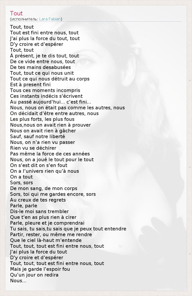Tout, tout Tout est fini entre nous, tout J'ai plus la force du tout, tout D'y croire et d'espérer Tout, tout À présent, je te dis tout, tout De ce vide entre nous, tout De tes mains desabusées Tout, tout ce qui nous unit Tout ce qui nous détruit au corps Est à present fini Tous ces moments incompris Ces instants indécis s'écrivent Au passé aujourd'hui... c'est fini... Nous, nous on était pas comme les autres, nous On décidait d'être entre autres, nous Les plus forts, les plus fous Nous,nous on avait rien à prouver Nous on avait rien à gâcher Sauf, sauf notre liberté Nous, on n'a rien vu passer Rien vu se déchirer Pas même la force de ces années Nous, on a joué le tout pour le tout On s'est dit on s'en fout On a l'univers rien qu'à nous On a tout Sors, sors De mon sang, de mon corps Sors, toi qui me gardes encore, sors Au creux de tes regrets Parle, parle Dis-le moi sans trembler Que t'en as plus rien à cirer Parle, pleure et je comprendrai Tu sais, tu sais,tu sais que je peux tout entendre Partir, rester, ou même me rendre Que le ciel là-haut m'entende Tout, tout, tout est fini entre nous, tout J'ai plus la force du tout D'y croire et d'espérer Tout, tout, tout est fini entre nous, tout Mais je garde l'espoir fou Qu'un jour on redira Nous...