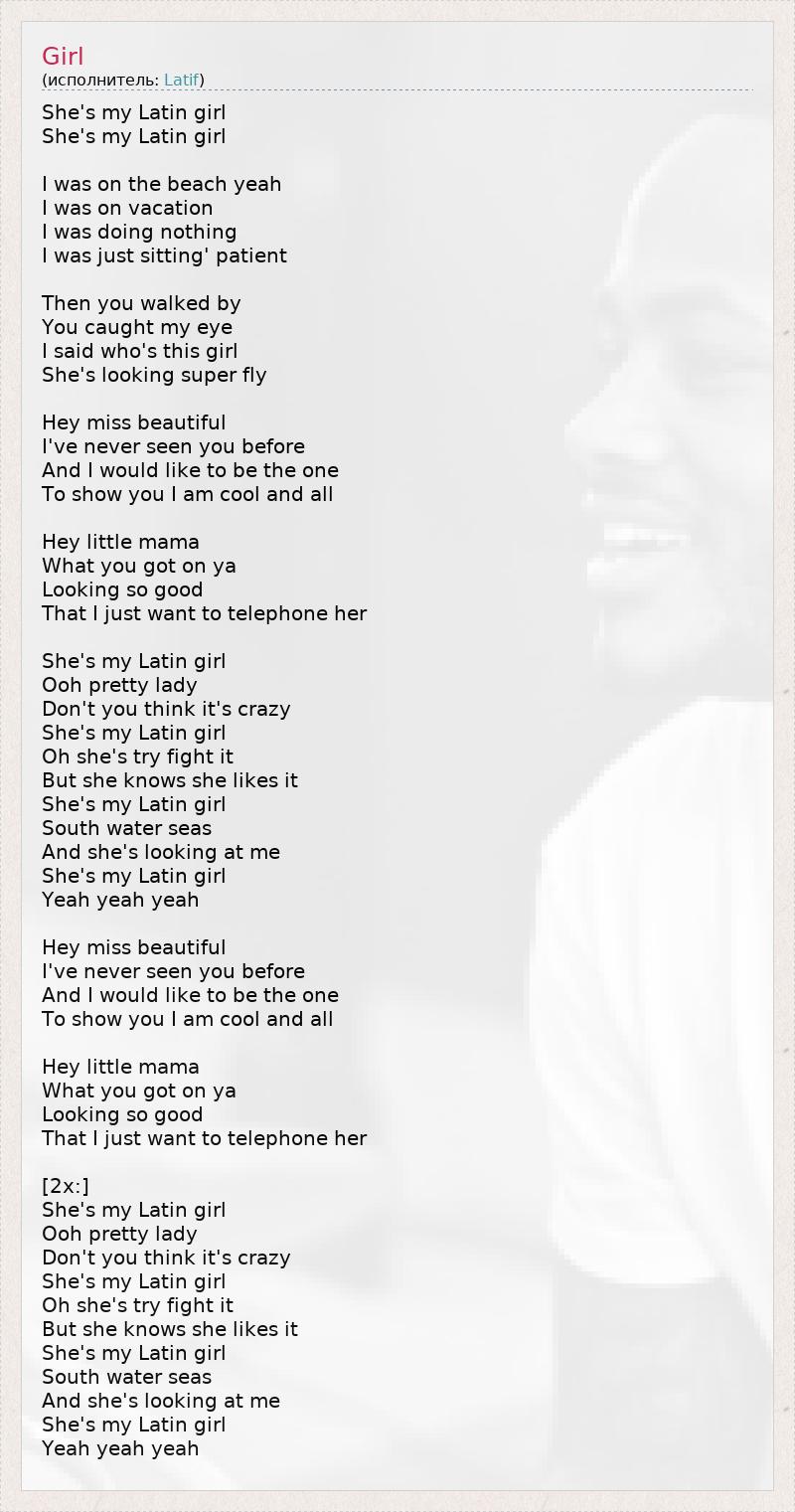 She's my Latin girl She's my Latin girl I was on the beach yeah I was on vacation I was doing nothing I was just sitting' patient Then you walked by You caught my eye I said who's this girl She's looking super fly Hey miss beautiful I've never seen you before And I would like to be the one To show you I am cool and all Hey little mama What you got on ya Looking so good That I just want to telephone her She's my Latin girl Ooh pretty lady Don't you think it's crazy She's my Latin girl Oh she's try fight it But she knows she likes it She's my Latin girl South water seas And she's looking at me She's my Latin girl Yeah yeah yeah Hey miss beautiful I've never seen you before And I would like to be the one To show you I am cool and all Hey little mama What you got on ya Looking so good That I just want to telephone her [2x:] She's my Latin girl Ooh pretty lady Don't you think it's crazy She's my Latin girl Oh she's try fight it But she knows she likes it She's my Latin girl South water seas And she's looking at me She's my Latin girl Yeah yeah yeah