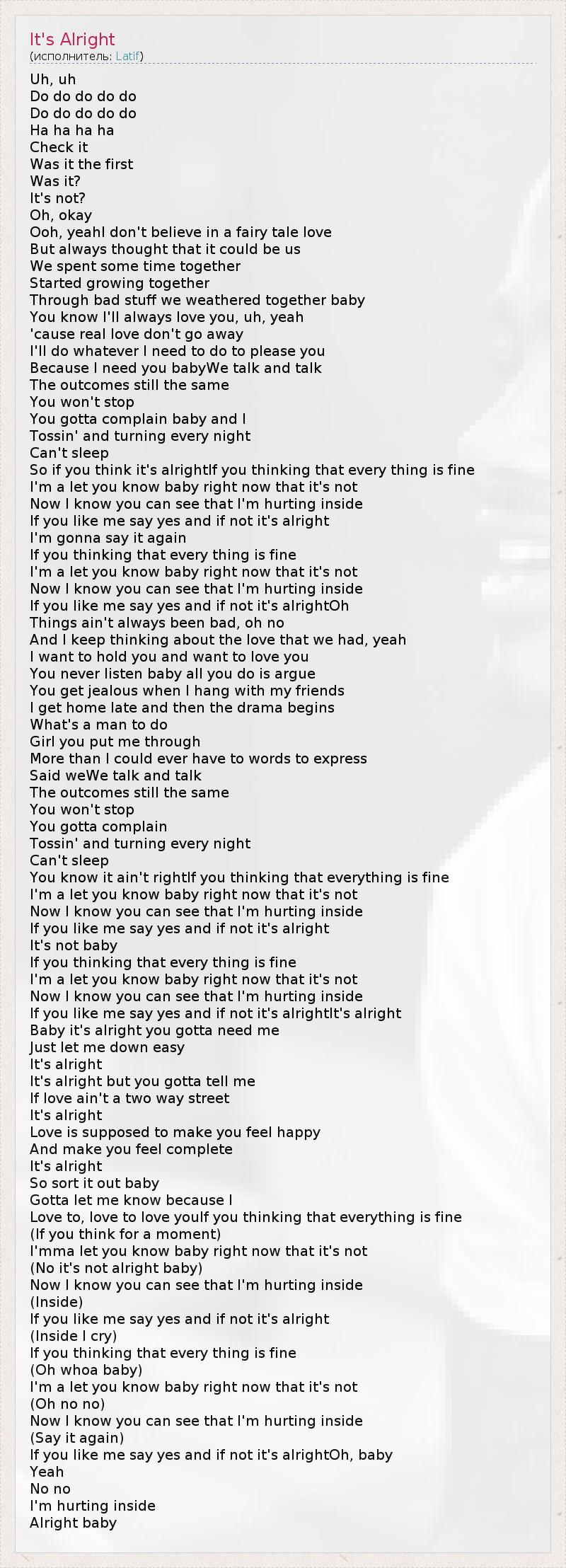 Uh, uh Do do do do do Do do do do do Ha ha ha ha Check it Was it the first Was it? It's not? Oh, okay Ooh, yeahI don't believe in a fairy tale love But always thought that it could be us We spent some time together Started growing together Through bad stuff we weathered together baby You know I'll always love you, uh, yeah 'cause real love don't go away I'll do whatever I need to do to please you Because I need you babyWe talk and talk The outcomes still the same You won't stop You gotta complain baby and I Tossin' and turning every night Can't sleep So if you think it's alrightIf you thinking that every thing is fine I'm a let you know baby right now that it's not Now I know you can see that I'm hurting inside If you like me say yes and if not it's alright I'm gonna say it again If you thinking that every thing is fine I'm a let you know baby right now that it's not Now I know you can see that I'm hurting inside If you like me say yes and if not it's alrightOh Things ain't always been bad, oh no And I keep thinking about the love that we had, yeah I want to hold you and want to love you You never listen baby all you do is argue You get jealous when I hang with my friends I get home late and then the drama begins What's a man to do Girl you put me through More than I could ever have to words to express Said weWe talk and talk The outcomes still the same You won't stop You gotta complain Tossin' and turning every night Can't sleep You know it ain't rightIf you thinking that everything is fine I'm a let you know baby right now that it's not Now I know you can see that I'm hurting inside If you like me say yes and if not it's alright It's not baby If you thinking that every thing is fine I'm a let you know baby right now that it's not Now I know you can see that I'm hurting inside If you like me say yes and if not it's alrightIt's alright Baby it's alright you gotta need me Just let me down easy It's alright It's alright but you gotta tell me If love ain't a two way street It's alright Love is supposed to make you feel happy And make you feel complete It's alright So sort it out baby Gotta let me know because I Love to, love to love youIf you thinking that everything is fine (If you think for a moment) I'mma let you know baby right now that it's not (No it's not alright baby) Now I know you can see that I'm hurting inside (Inside) If you like me say yes and if not it's alright (Inside I cry) If you thinking that every thing is fine (Oh whoa baby) I'm a let you know baby right now that it's not (Oh no no) Now I know you can see that I'm hurting inside (Say it again) If you like me say yes and if not it's alrightOh, baby Yeah No no I'm hurting inside Alright baby