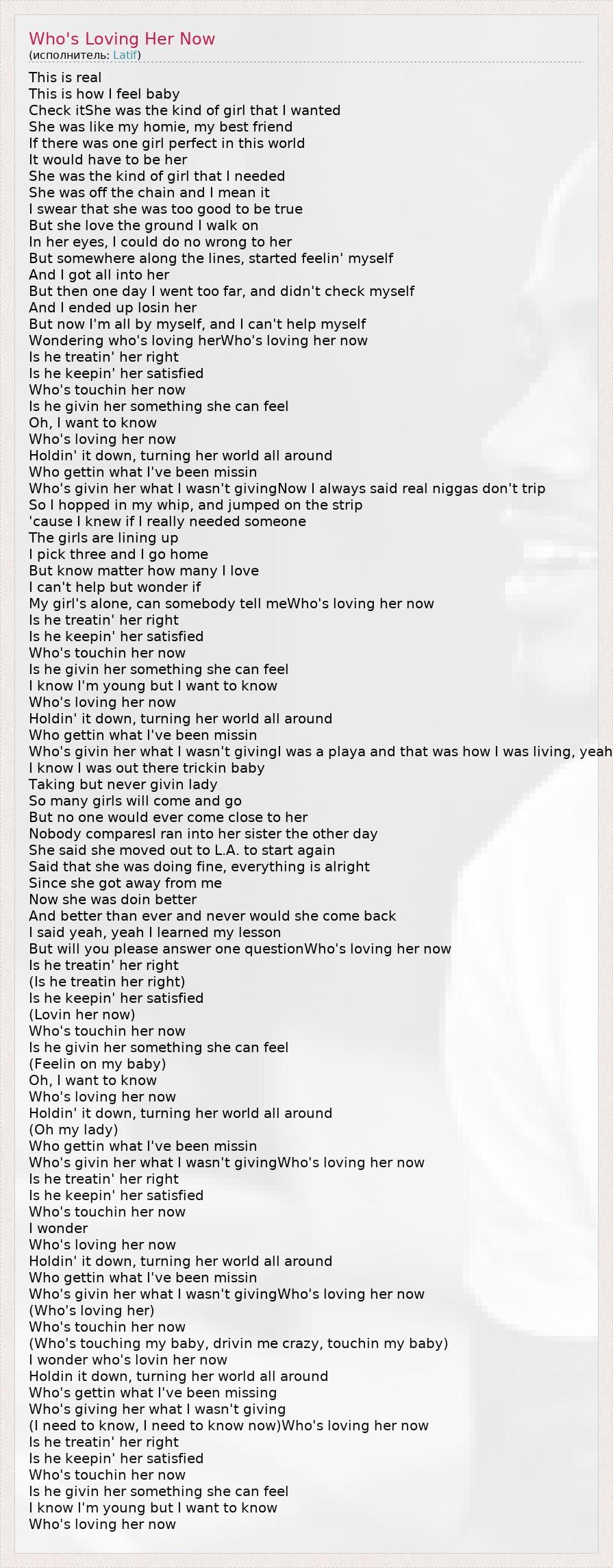 This is real This is how I feel baby Check itShe was the kind of girl that I wanted She was like my homie, my best friend If there was one girl perfect in this world It would have to be her She was the kind of girl that I needed She was off the chain and I mean it I swear that she was too good to be true But she love the ground I walk on In her eyes, I could do no wrong to her But somewhere along the lines, started feelin' myself And I got all into her But then one day I went too far, and didn't check myself And I ended up losin her But now I'm all by myself, and I can't help myself Wondering who's loving herWho's loving her now Is he treatin' her right Is he keepin' her satisfied Who's touchin her now Is he givin her something she can feel Oh, I want to know Who's loving her now Holdin' it down, turning her world all around Who gettin what I've been missin Who's givin her what I wasn't givingNow I always said real niggas don't trip So I hopped in my whip, and jumped on the strip 'cause I knew if I really needed someone The girls are lining up I pick three and I go home But know matter how many I love I can't help but wonder if My girl's alone, can somebody tell meWho's loving her now Is he treatin' her right Is he keepin' her satisfied Who's touchin her now Is he givin her something she can feel I know I'm young but I want to know Who's loving her now Holdin' it down, turning her world all around Who gettin what I've been missin Who's givin her what I wasn't givingI was a playa and that was how I was living, yeah I know I was out there trickin baby Taking but never givin lady So many girls will come and go But no one would ever come close to her Nobody comparesI ran into her sister the other day She said she moved out to L.A. to start again Said that she was doing fine, everything is alright Since she got away from me Now she was doin better And better than ever and never would she come back I said yeah, yeah I learned my lesson But will you please answer one questionWho's loving her now Is he treatin' her right (Is he treatin her right) Is he keepin' her satisfied (Lovin her now) Who's touchin her now Is he givin her something she can feel (Feelin on my baby) Oh, I want to know Who's loving her now Holdin' it down, turning her world all around (Oh my lady) Who gettin what I've been missin Who's givin her what I wasn't givingWho's loving her now Is he treatin' her right Is he keepin' her satisfied Who's touchin her now I wonder Who's loving her now Holdin' it down, turning her world all around Who gettin what I've been missin Who's givin her what I wasn't givingWho's loving her now (Who's loving her) Who's touchin her now (Who's touching my baby, drivin me crazy, touchin my baby) I wonder who's lovin her now Holdin it down, turning her world all around Who's gettin what I've been missing Who's giving her what I wasn't giving (I need to know, I need to know now)Who's loving her now Is he treatin' her right Is he keepin' her satisfied Who's touchin her now Is he givin her something she can feel I know I'm young but I want to know Who's loving her now