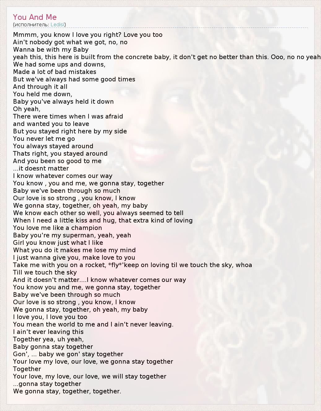Mmmm, you know I love you right? Love you too Ain't nobody got what we got, no, no Wanna be with my Baby yeah this, this here is built from the concrete baby, it don't get no better than this. Ooo, no no yeah We had some ups and downs, Made a lot of bad mistakes But we've always had some good times And through it all You held me down, Baby you've always held it down Oh yeah, There were times when I was afraid and wanted you to leave But you stayed right here by my side You never let me go You always stayed around Thats right, you stayed around And you been so good to me ...it doesnt matter I know whatever comes our way You know , you and me, we gonna stay, together Baby we've been through so much Our love is so strong , you know, I know We gonna stay, together, oh yeah, my baby We know each other so well, you always seemed to tell When I need a little kiss and hug, that extra kind of loving You love me like a champion Baby you're my superman, yeah, yeah Girl you know just what I like What you do it makes me lose my mind I just wanna give you, make love to you Take me with you on a rocket, *fly*'keep on loving til we touch the sky, whoa Till we touch the sky And it doesn't matter....I know whatever comes our way You know you and me, we gonna stay, together Baby we've been through so much Our love is so strong , you know, I know We gonna stay, together, oh yeah, my baby I love you, I love you too You mean the world to me and I ain't never leaving. I ain't ever leaving this Together yea, uh yeah, Baby gonna stay together Gon', ... baby we gon' stay together Your love my love, our love, we gonna stay together Together Your love, my love, our love, we will stay together ...gonna stay together We gonna stay, together, together.