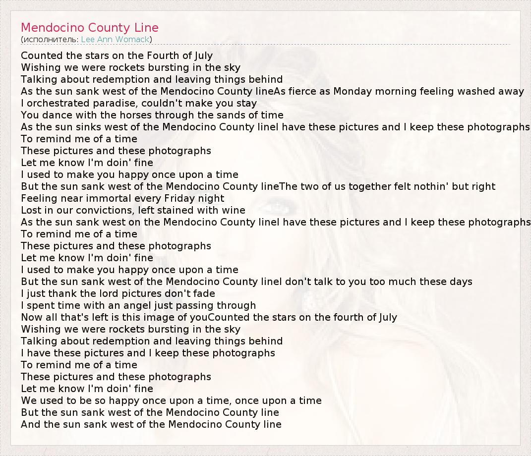 Counted the stars on the Fourth of July Wishing we were rockets bursting in the sky Talking about redemption and leaving things behind As the sun sank west of the Mendocino County lineAs fierce as Monday morning feeling washed away I orchestrated paradise, couldn't make you stay You dance with the horses through the sands of time As the sun sinks west of the Mendocino County lineI have these pictures and I keep these photographs To remind me of a time These pictures and these photographs Let me know I'm doin' fine I used to make you happy once upon a time But the sun sank west of the Mendocino County lineThe two of us together felt nothin' but right Feeling near immortal every Friday night Lost in our convictions, left stained with wine As the sun sank west on the Mendocino County lineI have these pictures and I keep these photographs To remind me of a time These pictures and these photographs Let me know I'm doin' fine I used to make you happy once upon a time But the sun sank west of the Mendocino County lineI don't talk to you too much these days I just thank the lord pictures don't fade I spent time with an angel just passing through Now all that's left is this image of youCounted the stars on the fourth of July Wishing we were rockets bursting in the sky Talking about redemption and leaving things behind I have these pictures and I keep these photographs To remind me of a time These pictures and these photographs Let me know I'm doin' fine We used to be so happy once upon a time, once upon a time But the sun sank west of the Mendocino County line And the sun sank west of the Mendocino County line