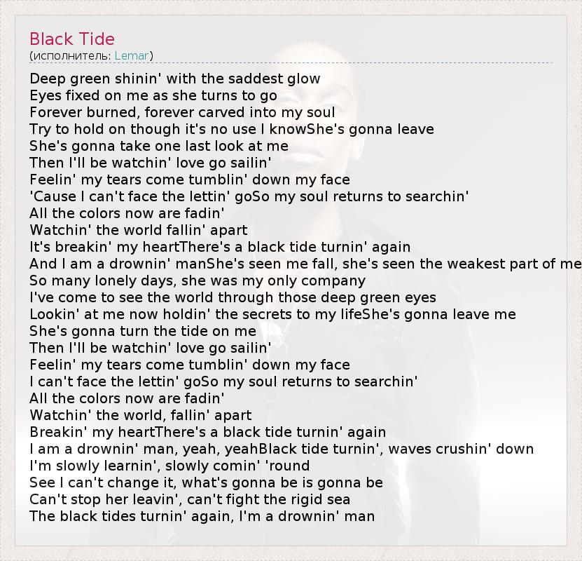 Deep green shinin' with the saddest glow Eyes fixed on me as she turns to go Forever burned, forever carved into my soul Try to hold on though it's no use I knowShe's gonna leave She's gonna take one last look at me Then I'll be watchin' love go sailin' Feelin' my tears come tumblin' down my face 'Cause I can't face the lettin' goSo my soul returns to searchin' All the colors now are fadin' Watchin' the world fallin' apart It's breakin' my heartThere's a black tide turnin' again And I am a drownin' manShe's seen me fall, she's seen the weakest part of me So many lonely days, she was my only company I've come to see the world through those deep green eyes Lookin' at me now holdin' the secrets to my lifeShe's gonna leave me She's gonna turn the tide on me Then I'll be watchin' love go sailin' Feelin' my tears come tumblin' down my face I can't face the lettin' goSo my soul returns to searchin' All the colors now are fadin' Watchin' the world, fallin' apart Breakin' my heartThere's a black tide turnin' again I am a drownin' man, yeah, yeahBlack tide turnin', waves crushin' down I'm slowly learnin', slowly comin' 'round See I can't change it, what's gonna be is gonna be Can't stop her leavin', can't fight the rigid sea The black tides turnin' again, I'm a drownin' man