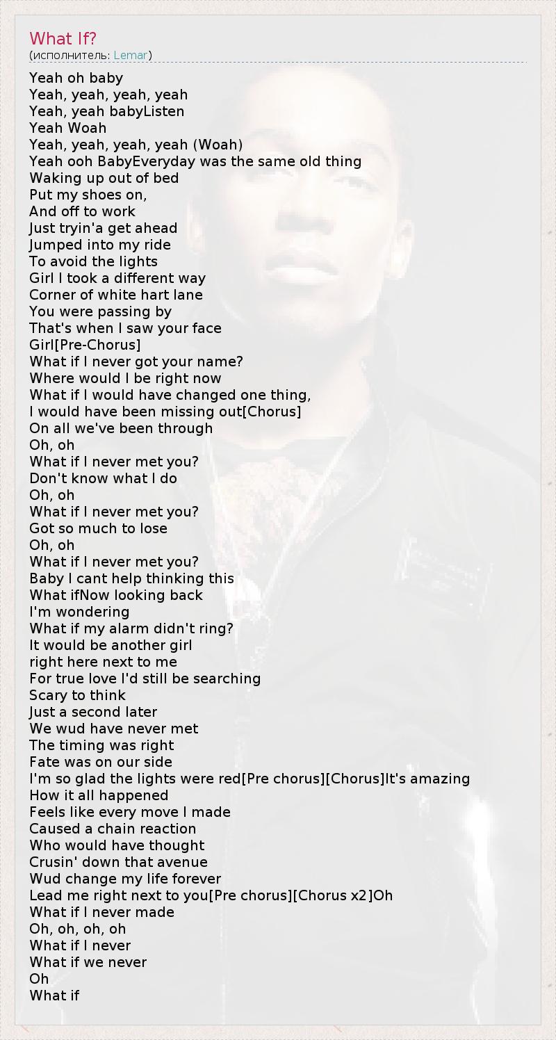 Yeah oh baby Yeah, yeah, yeah, yeah Yeah, yeah babyListen Yeah Woah Yeah, yeah, yeah, yeah (Woah) Yeah ooh BabyEveryday was the same old thing Waking up out of bed Put my shoes on, And off to work Just tryin'a get ahead Jumped into my ride To avoid the lights Girl I took a different way Corner of white hart lane You were passing by That's when I saw your face Girl[Pre-Chorus] What if I never got your name? Where would I be right now What if I would have changed one thing, I would have been missing out[Chorus] On all we've been through Oh, oh What if I never met you? Don't know what I do Oh, oh What if I never met you? Got so much to lose Oh, oh What if I never met you? Baby I cant help thinking this What ifNow looking back I'm wondering What if my alarm didn't ring? It would be another girl right here next to me For true love I'd still be searching Scary to think Just a second later We wud have never met The timing was right Fate was on our side I'm so glad the lights were red[Pre chorus][Chorus]It's amazing How it all happened Feels like every move I made Caused a chain reaction Who would have thought Crusin' down that avenue Wud change my life forever Lead me right next to you[Pre chorus][Chorus x2]Oh What if I never made Oh, oh, oh, oh What if I never What if we never Oh What if
