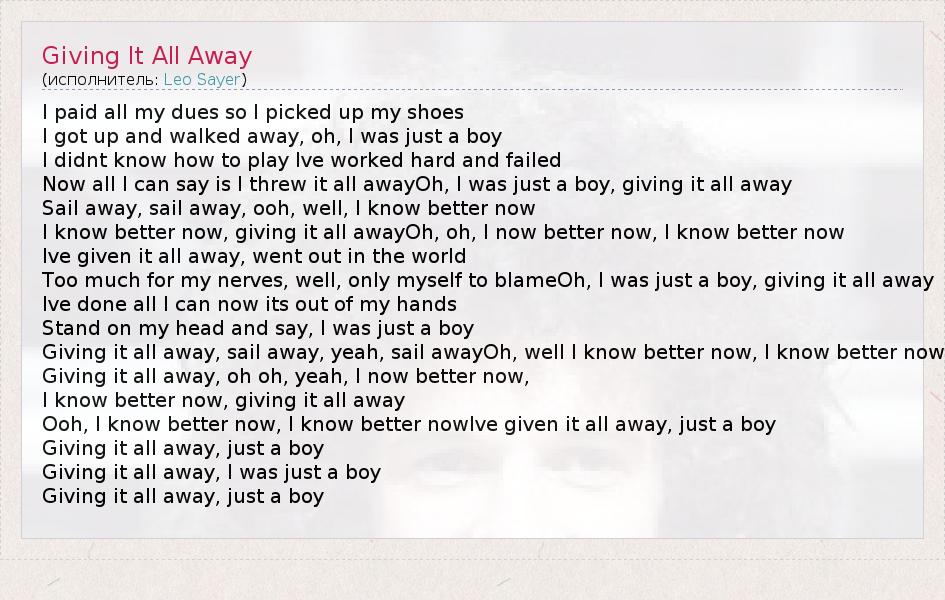 А как ты думаешь, о чем песня "Giving It All Away" ?