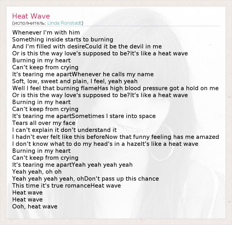 Whenever I'm with him Something inside starts to burning And I'm filled with desireCould it be the devil in me Or is this the way love's supposed to be?It's like a heat wave Burning in my heart Can't keep from crying It's tearing me apartWhenever he calls my name Soft, low, sweet and plain, I feel, yeah yeah Well I feel that burning flameHas high blood pressure got a hold on me Or is this the way love's supposed to be?It's like a heat wave Burning in my heart Can't keep from crying It's tearing me apartSometimes I stare into space Tears all over my face I can't explain it don't understand it I hadn't ever felt like this beforeNow that funny feeling has me amazed I don't know what to do my head's in a hazeIt's like a heat wave Burning in my heart Can't keep from crying It's tearing me apartYeah yeah yeah yeah Yeah yeah, oh oh Yeah yeah yeah yeah, ohDon't pass up this chance This time it's true romanceHeat wave Heat wave Heat wave Ooh, heat wave