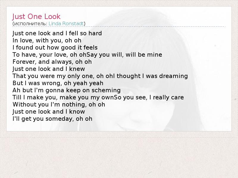 Just one look and I fell so hard In love, with you, oh oh I found out how good it feels To have, your love, oh ohSay you will, will be mine Forever, and always, oh oh Just one look and I knew That you were my only one, oh ohI thought I was dreaming But I was wrong, oh yeah yeah Ah but I'm gonna keep on scheming Till I make you, make you my ownSo you see, I really care Without you I'm nothing, oh oh Just one look and I know I'll get you someday, oh oh