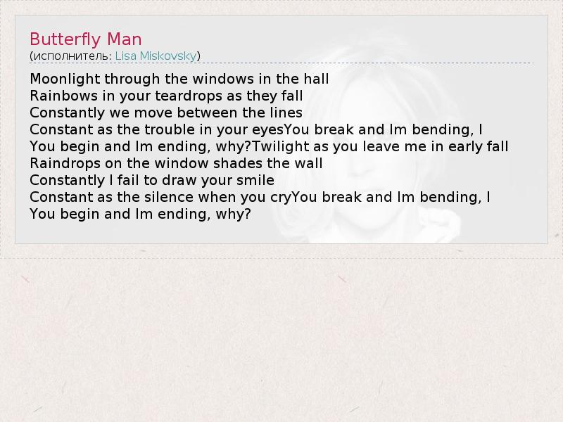 А как ты думаешь, о чем песня "Butterfly Man" ?