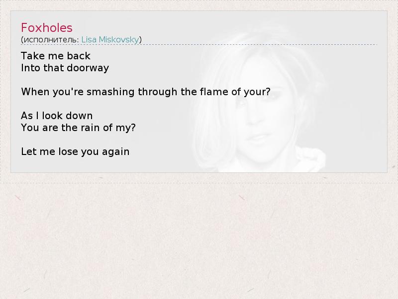 Это интересно:Лиза Мисковски (Lisa Miskovsky) – шведская певица и автор песен. Её дебютный альбом "Lisa Miskovsky" и сингл "Driving One Of Your Cars" (релиз в Швеции в 2001 году) быстро вошли в шведские чарты рок-музыки, и певица завоевала сразу два шведских «Грэмми»: в категории «Лучший ньюкамер» и «Лучшая певица». В 2003 году вышел альбом "Fallingwater", спродюссированный Иоакимом Бергом (Joakim Berg) – солистом шведской... продолжение