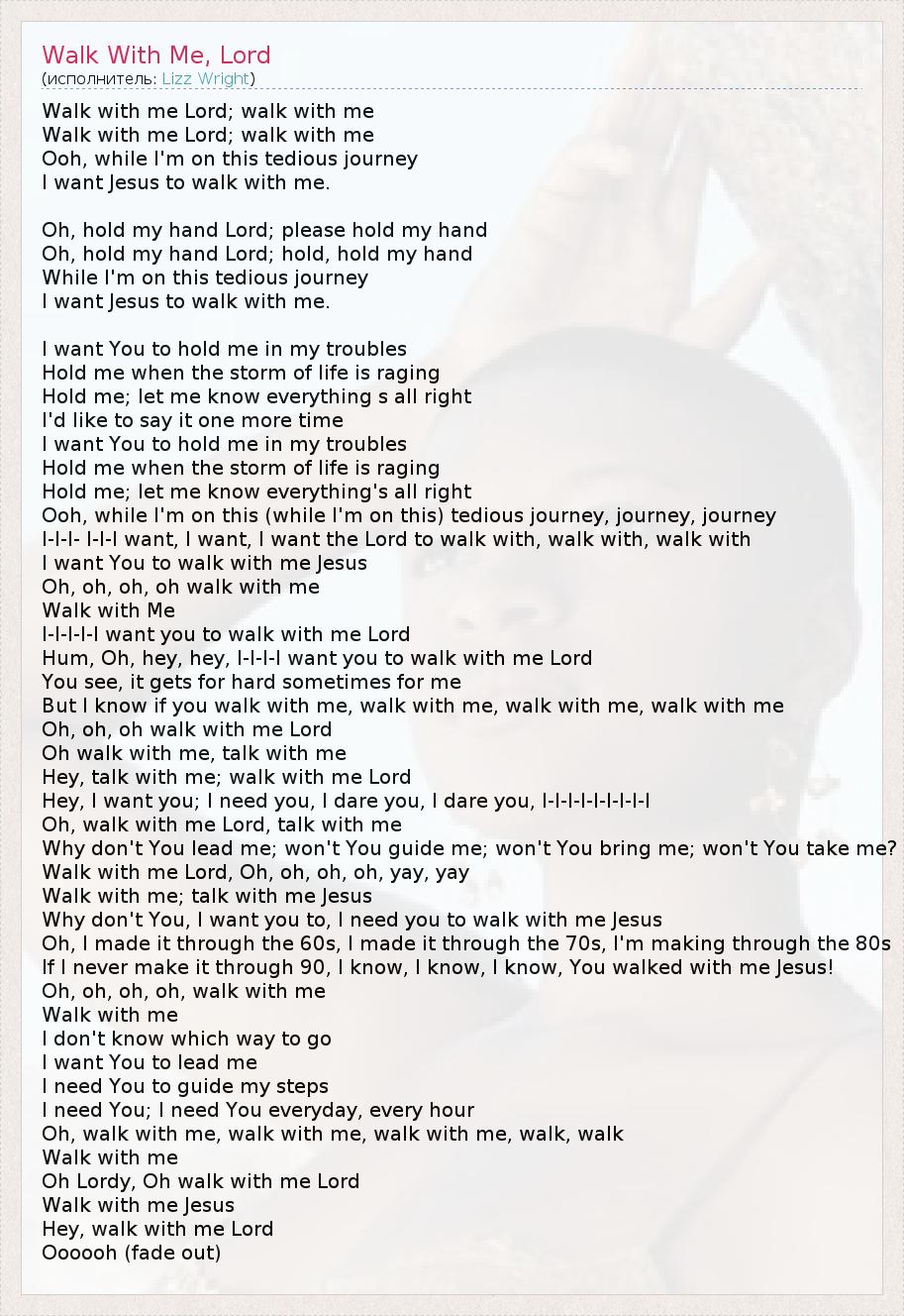 Walk with me Lord; walk with me Walk with me Lord; walk with me Ooh, while I'm on this tedious journey I want Jesus to walk with me. Oh, hold my hand Lord; please hold my hand Oh, hold my hand Lord; hold, hold my hand While I'm on this tedious journey I want Jesus to walk with me. I want You to hold me in my troubles Hold me when the storm of life is raging Hold me; let me know everything s all right I'd like to say it one more time I want You to hold me in my troubles Hold me when the storm of life is raging Hold me; let me know everything's all right Ooh, while I'm on this (while I'm on this) tedious journey, journey, journey I-I-I- I-I-I want, I want, I want the Lord to walk with, walk with, walk with I want You to walk with me Jesus Oh, oh, oh, oh walk with me Walk with Me I-I-I-I-I want you to walk with me Lord Hum, Oh, hey, hey, I-I-I-I want you to walk with me Lord You see, it gets for hard sometimes for me But I know if you walk with me, walk with me, walk with me, walk with me Oh, oh, oh walk with me Lord Oh walk with me, talk with me Hey, talk with me; walk with me Lord Hey, I want you; I need you, I dare you, I dare you, I-I-I-I-I-I-I-I-I Oh, walk with me Lord, talk with me Why don't You lead me; won't You guide me; won't You bring me; won't You take me? Walk with me Lord, Oh, oh, oh, oh, yay, yay Walk with me; talk with me Jesus Why don't You, I want you to, I need you to walk with me Jesus Oh, I made it through the 60s, I made it through the 70s, I'm making through the 80s If I never make it through 90, I know, I know, I know, You walked with me Jesus! Oh, oh, oh, oh, walk with me Walk with me I don't know which way to go I want You to lead me I need You to guide my steps I need You; I need You everyday, every hour Oh, walk with me, walk with me, walk with me, walk, walk Walk with me Oh Lordy, Oh walk with me Lord Walk with me Jesus Hey, walk with me Lord Oooooh (fade out)