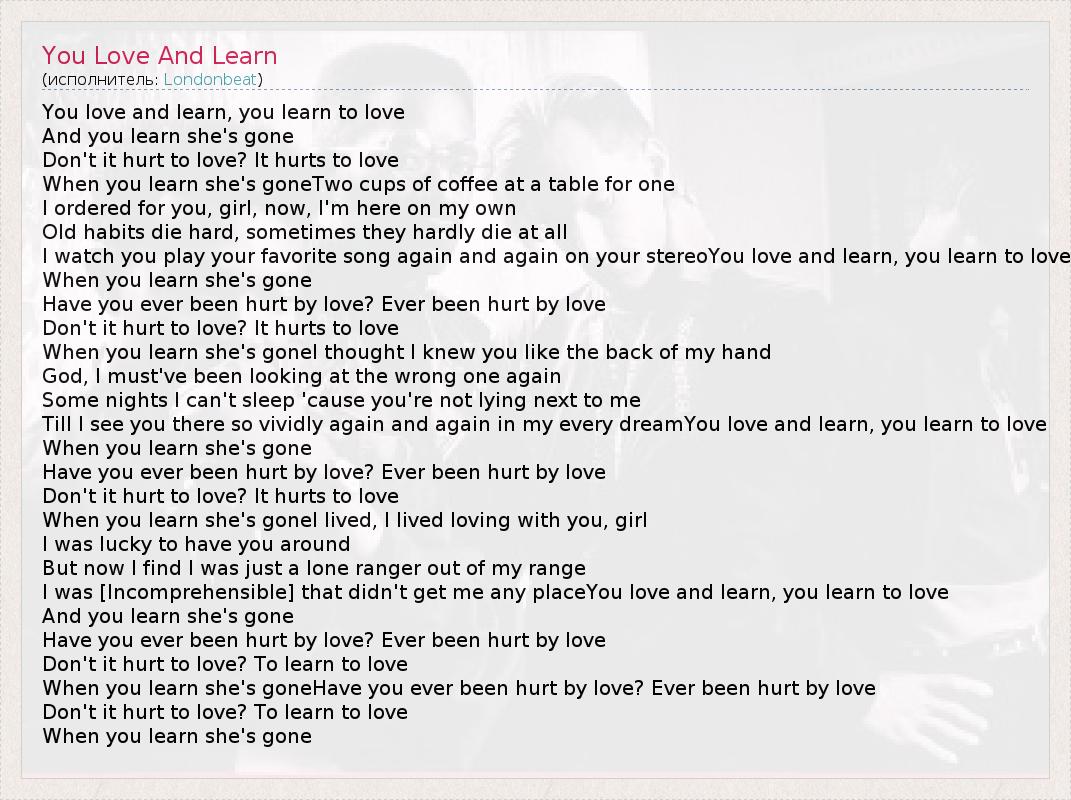 You love and learn, you learn to love And you learn she's gone Don't it hurt to love? It hurts to love When you learn she's goneTwo cups of coffee at a table for one I ordered for you, girl, now, I'm here on my own Old habits die hard, sometimes they hardly die at all I watch you play your favorite song again and again on your stereoYou love and learn, you learn to love When you learn she's gone Have you ever been hurt by love? Ever been hurt by love Don't it hurt to love? It hurts to love When you learn she's goneI thought I knew you like the back of my hand God, I must've been looking at the wrong one again Some nights I can't sleep 'cause you're not lying next to me Till I see you there so vividly again and again in my every dreamYou love and learn, you learn to love When you learn she's gone Have you ever been hurt by love? Ever been hurt by love Don't it hurt to love? It hurts to love When you learn she's goneI lived, I lived loving with you, girl I was lucky to have you around But now I find I was just a lone ranger out of my range I was [Incomprehensible] that didn't get me any placeYou love and learn, you learn to love And you learn she's gone Have you ever been hurt by love? Ever been hurt by love Don't it hurt to love? To learn to love When you learn she's goneHave you ever been hurt by love? Ever been hurt by love Don't it hurt to love? To learn to love When you learn she's gone