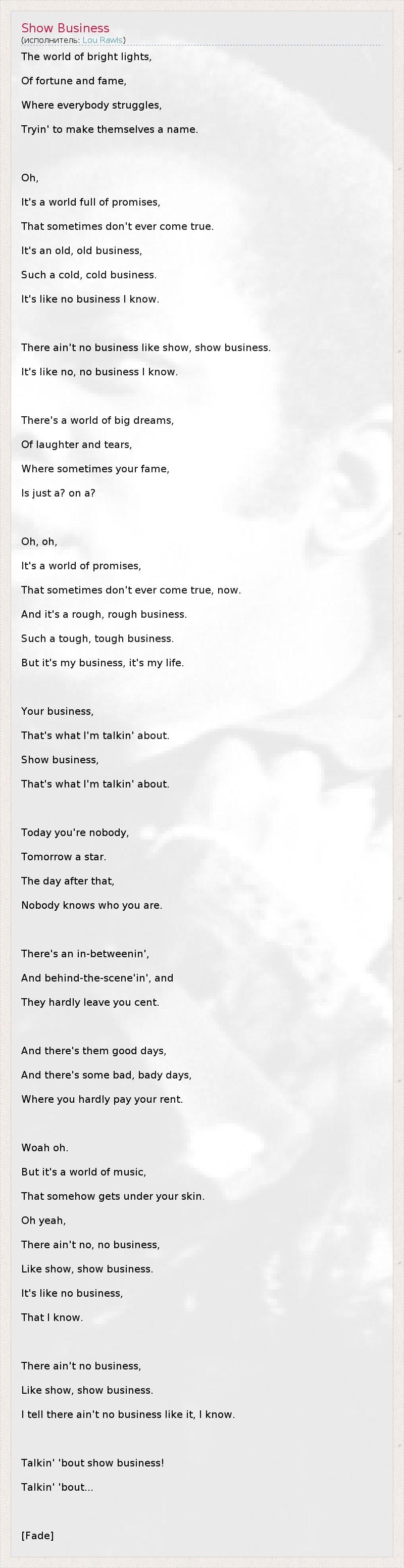 Это интересно:Популярность этого черного исполнителя стабильна с 50-х годов, его блюз-соул привлекает слушателей сегодня, как и тридцать лет назад. Лу Ролз вырос в южной части Чикаго, с детства начал петь в церковном хоре. В середине 50-х годов Ролз вошел в состав лос-анджелеской госпелэ-группы Pilgrim Travelers, в 1956 году певец был призван в армию. После демобилизации он некоторое время выступал в составе концертной... продолжение
