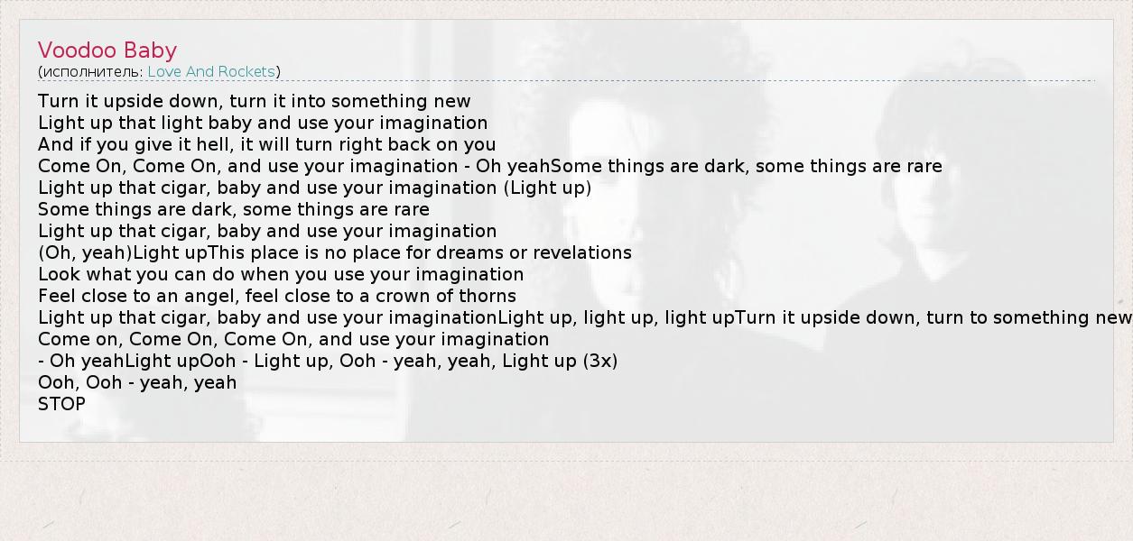 А как ты думаешь, о чем песня "Voodoo Baby" ?
