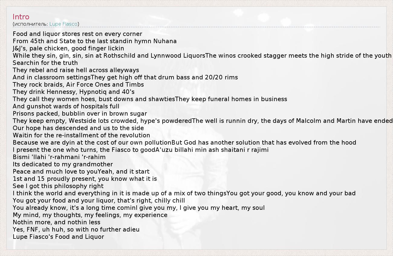 Food and liquor stores rest on every corner From 45th and State to the last standin hymn Nuhana J&J's, pale chicken, good finger lickin While they sin, gin, sin, sin at Rothschild and Lynnwood LiquorsThe winos crooked stagger meets the high stride of the youth Searchin for the truth They rebel and raise hell across alleyways And in classroom settingsThey get high off that drum bass and 20/20 rims They rock braids, Air Force Ones and Timbs They drink Hennessy, Hypnotiq and 40's They call they women hoes, bust downs and shawtiesThey keep funeral homes in business And gunshot wards of hospitals full Prisons packed, bubblin over in brown sugar They keep empty, Westside lots crowded, hype's powderedThe well is runnin dry, the days of Malcolm and Martin have ended Our hope has descended and us to the side Waitin for the re-installment of the revolution Because we are dyin at the cost of our own pollutionBut God has another solution that has evolved from the hood I present the one who turns, the Fiasco to goodA'uzu billahi min ash shaitani r rajimi Bismi 'llahi 'r-rahmani 'r-rahim Its dedicated to my grandmother Peace and much love to youYeah, and it start 1st and 15 proudly present, you know what it is See I got this philosophy right I think the world and everything in it is made up of a mix of two thingsYou got your good, you know and your bad You got your food and your liquor, that's right, chilly chill You already know, it's a long time cominI give you my, I give you my heart, my soul My mind, my thoughts, my feelings, my experience Nothin more, and nothin less Yes, FNF, uh huh, so with no further adieu Lupe Fiasco's Food and Liquor