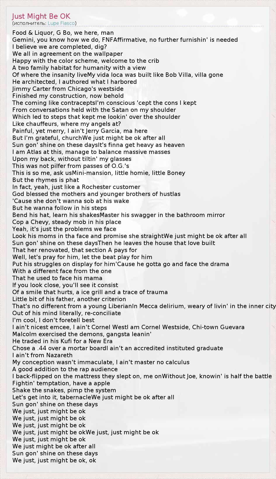 Food & Liquor, G Bo, we here, man Gemini, you know how we do, FNFAffirmative, no further furnishin' is needed I believe we are completed, dig? We all in agreement on the wallpaper Happy with the color scheme, welcome to the crib A two family habitat for humanity with a view Of where the insanity liveMy vida loca was built like Bob Villa, villa gone He architected, I authored what I harbored Jimmy Carter from Chicago's westside Finished my construction, now behold The coming like contraceptsI'm conscious 'cept the cons I kept From conversations held with the Satan on my shoulder Which led to steps that kept me lookin' over the shoulder Like chauffeurs, where my angels at? Painful, yet merry, I ain't Jerry Garcia, ma here But I'm grateful, churchWe just might be ok after all Sun gon' shine on these daysIt's finna get heavy as heaven I am Atlas at this, manage to balance massive masses Upon my back, without tiltin' my glasses This was not pilfer from passes of O.G.'s This is so me, ask usMini-mansion, little homie, little Boney But the rhymes is phat In fact, yeah, just like a Rochester customer God blessed the mothers and younger brothers of hustlas 'Cause she don't wanna sob at his wake But he wanna follow in his steps Bend his hat, learn his shakesMaster his swagger in the bathroom mirror Cop a Chevy, steady mob in his place Yeah, it's just the problems we face Look his moms in tha face and promise she straightWe just might be ok after all Sun gon' shine on these daysThen he leaves the house that love built That her renovated, that section A pays for Well, let's pray for him, let the beat play for him Put his struggles on display for him'Cause he gotta go and face the drama With a different face from the one That he used to face his mama If you look close, you'll see it consist Of a smile that hurts, a ice grill and a trace of trauma Little bit of his father, another criterion That's no different from a young LiberianIn Mecca delirium, weary of livin' in the inner city Out of his mind literally, re-conciliate I'm cool, I don't foretell best I ain't nicest emcee, I ain't Cornel WestI am Cornel Westside, Chi-town Guevara Malcolm exercised the demons, gangsta leanin' He traded in his Kufi for a New Era Chose a .44 over a mortar boardI ain't an accredited instituted graduate I ain't from Nazareth My conception wasn't immaculate, I ain't master no calculus A good addition to the rap audience I back-flipped on the mattress they slept on, me onWithout Joe, knowin' is half the battle Fightin' temptation, have a apple Shake the snakes, pimp the system Let's get into it, tabernacleWe just might be ok after all Sun gon' shine on these days We just, just might be ok We just, just might be ok We just, just might be ok We just, just might be okWe just, just might be ok We just, just might be ok We just might be ok after all Sun gon' shine on these days We just, just might be ok, ok