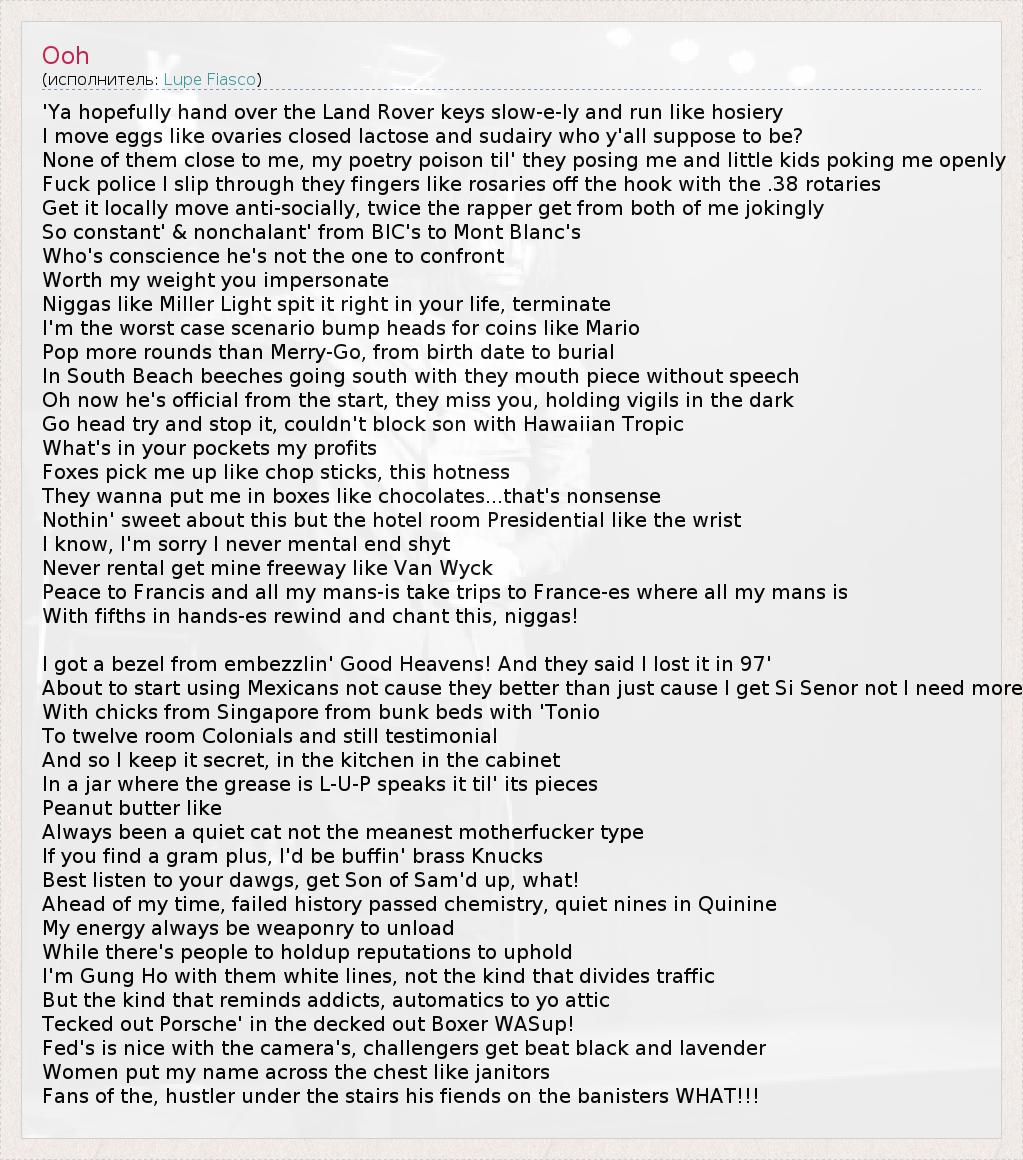 Это интересно:Wasalu Muhammad Jaco (родился 16 февраля, 1982 года), рэп-исполнитель, выступающий и выпускающий альбомы под псевдонимом Lupe Fiasco (произносится — Люпэ Фиаско). На 50-ой церемонии «Грэмми» получил награду за песню «Daydreamin'», исполненную совместно с Jill Scott, в номинации «Лучшее урбан/альтернативное исполнение». Стал известен в 2006 году, благодаря дебютному альбому «Lupe Fiasco’s Food & Liquor», который был одобрен... продолжение