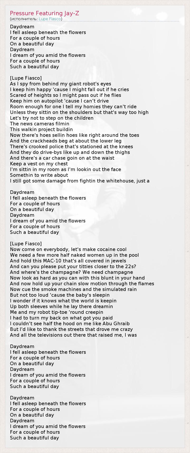 А как ты думаешь, о чем песня "Pressure Featuring Jay-Z" ?