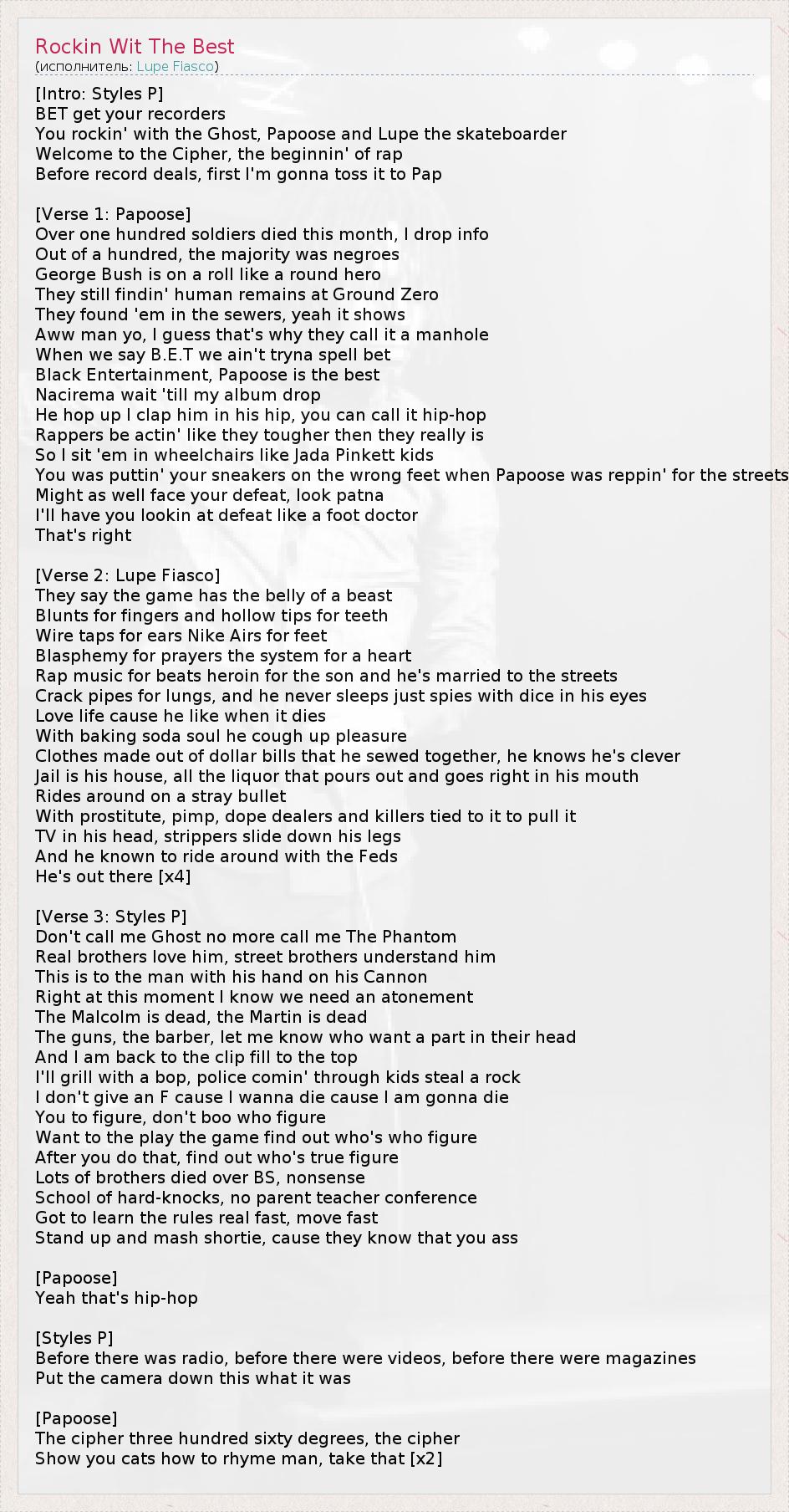 [Intro: Styles P] BET get your recorders You rockin' with the Ghost, Papoose and Lupe the skateboarder Welcome to the Cipher, the beginnin' of rap Before record deals, first I'm gonna toss it to Pap [Verse 1: Papoose] Over one hundred soldiers died this month, I drop info Out of a hundred, the majority was negroes George Bush is on a roll like a round hero They still findin' human remains at Ground Zero They found 'em in the sewers, yeah it shows Aww man yo, I guess that's why they call it a manhole When we say B.E.T we ain't tryna spell bet Black Entertainment, Papoose is the best Nacirema wait 'till my album drop He hop up I clap him in his hip, you can call it hip-hop Rappers be actin' like they tougher then they really is So I sit 'em in wheelchairs like Jada Pinkett kids You was puttin' your sneakers on the wrong feet when Papoose was reppin' for the streets Might as well face your defeat, look patna I'll have you lookin at defeat like a foot doctor That's right [Verse 2: Lupe Fiasco] They say the game has the belly of a beast Blunts for fingers and hollow tips for teeth Wire taps for ears Nike Airs for feet Blasphemy for prayers the system for a heart Rap music for beats heroin for the son and he's married to the streets Crack pipes for lungs, and he never sleeps just spies with dice in his eyes Love life cause he like when it dies With baking soda soul he cough up pleasure Clothes made out of dollar bills that he sewed together, he knows he's clever Jail is his house, all the liquor that pours out and goes right in his mouth Rides around on a stray bullet With prostitute, pimp, dope dealers and killers tied to it to pull it TV in his head, strippers slide down his legs And he known to ride around with the Feds He's out there [x4] [Verse 3: Styles P] Don't call me Ghost no more call me The Phantom Real brothers love him, street brothers understand him This is to the man with his hand on his Cannon Right at this moment I know we need an atonement The Malcolm is dead, the Martin is dead The guns, the barber, let me know who want a part in their head And I am back to the clip fill to the top I'll grill with a bop, police comin' through kids steal a rock I don't give an F cause I wanna die cause I am gonna die You to figure, don't boo who figure Want to the play the game find out who's who figure After you do that, find out who's true figure Lots of brothers died over BS, nonsense School of hard-knocks, no parent teacher conference Got to learn the rules real fast, move fast Stand up and mash shortie, cause they know that you ass [Papoose] Yeah that's hip-hop [Styles P] Before there was radio, before there were videos, before there were magazines Put the camera down this what it was [Papoose] The cipher three hundred sixty degrees, the cipher Show you cats how to rhyme man, take that [x2]