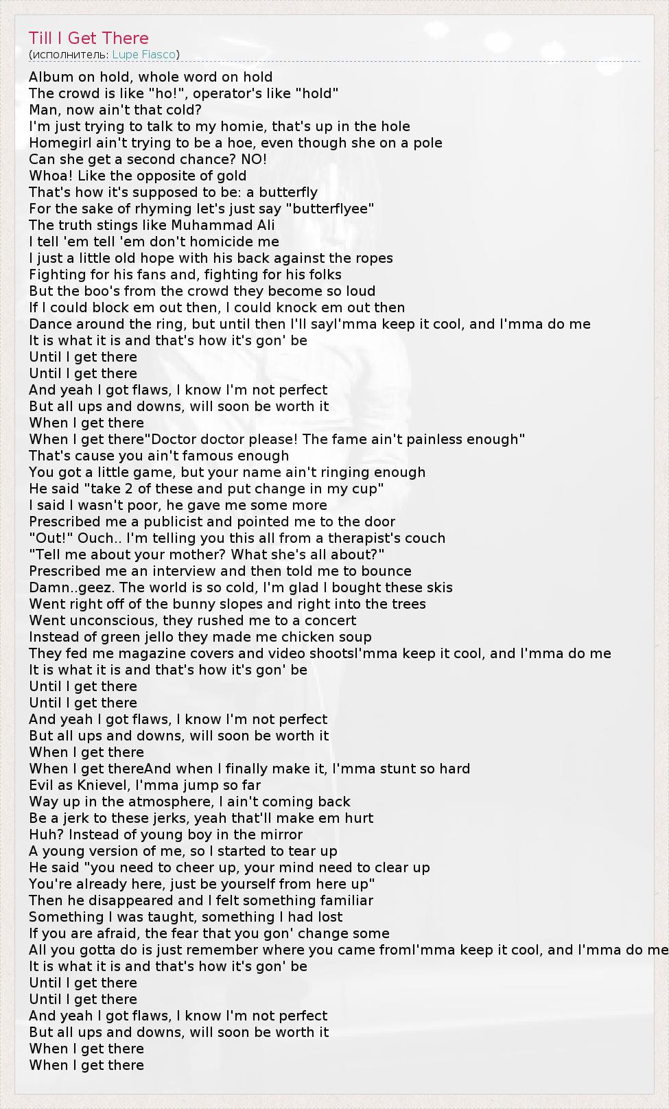 Album on hold, whole word on hold The crowd is like "ho!", operator's like "hold" Man, now ain't that cold? I'm just trying to talk to my homie, that's up in the hole Homegirl ain't trying to be a hoe, even though she on a pole Can she get a second chance? NO! Whoa! Like the opposite of gold That's how it's supposed to be: a butterfly For the sake of rhyming let's just say "butterflyee" The truth stings like Muhammad Ali I tell 'em tell 'em don't homicide me I just a little old hope with his back against the ropes Fighting for his fans and, fighting for his folks But the boo's from the crowd they become so loud If I could block em out then, I could knock em out then Dance around the ring, but until then I'll sayI'mma keep it cool, and I'mma do me It is what it is and that's how it's gon' be Until I get there Until I get there And yeah I got flaws, I know I'm not perfect But all ups and downs, will soon be worth it When I get there When I get there"Doctor doctor please! The fame ain't painless enough" That's cause you ain't famous enough You got a little game, but your name ain't ringing enough He said "take 2 of these and put change in my cup" I said I wasn't poor, he gave me some more Prescribed me a publicist and pointed me to the door "Out!" Ouch.. I'm telling you this all from a therapist's couch "Tell me about your mother? What she's all about?" Prescribed me an interview and then told me to bounce Damn..geez. The world is so cold, I'm glad I bought these skis Went right off of the bunny slopes and right into the trees Went unconscious, they rushed me to a concert Instead of green jello they made me chicken soup They fed me magazine covers and video shootsI'mma keep it cool, and I'mma do me It is what it is and that's how it's gon' be Until I get there Until I get there And yeah I got flaws, I know I'm not perfect But all ups and downs, will soon be worth it When I get there When I get thereAnd when I finally make it, I'mma stunt so hard Evil as Knievel, I'mma jump so far Way up in the atmosphere, I ain't coming back Be a jerk to these jerks, yeah that'll make em hurt Huh? Instead of young boy in the mirror A young version of me, so I started to tear up He said "you need to cheer up, your mind need to clear up You're already here, just be yourself from here up" Then he disappeared and I felt something familiar Something I was taught, something I had lost If you are afraid, the fear that you gon' change some All you gotta do is just remember where you came fromI'mma keep it cool, and I'mma do me It is what it is and that's how it's gon' be Until I get there Until I get there And yeah I got flaws, I know I'm not perfect But all ups and downs, will soon be worth it When I get there When I get there