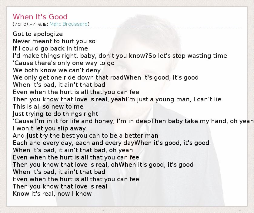 Got to apologize Never meant to hurt you so If I could go back in time I'd make things right, baby, don't you know?So let's stop wasting time 'Cause there's only one way to go We both know we can't deny We only get one ride down that roadWhen it's good, it's good When it's bad, it ain't that bad Even when the hurt is all that you can feel Then you know that love is real, yeahI'm just a young man, I can't lie This is all so new to me Just trying to do things right 'Cause I'm in it for life and honey, I'm in deepThen baby take my hand, oh yeah I won't let you slip away And just try the best you can to be a better man Each and every day, each and every dayWhen it's good, it's good When it's bad, it ain't that bad, oh yeah Even when the hurt is all that you can feel Then you know that love is real, ohWhen it's good, it's good When it's bad, it ain't that bad Even when the hurt is all that you can feel Then you know that love is real Know it's real, now I know