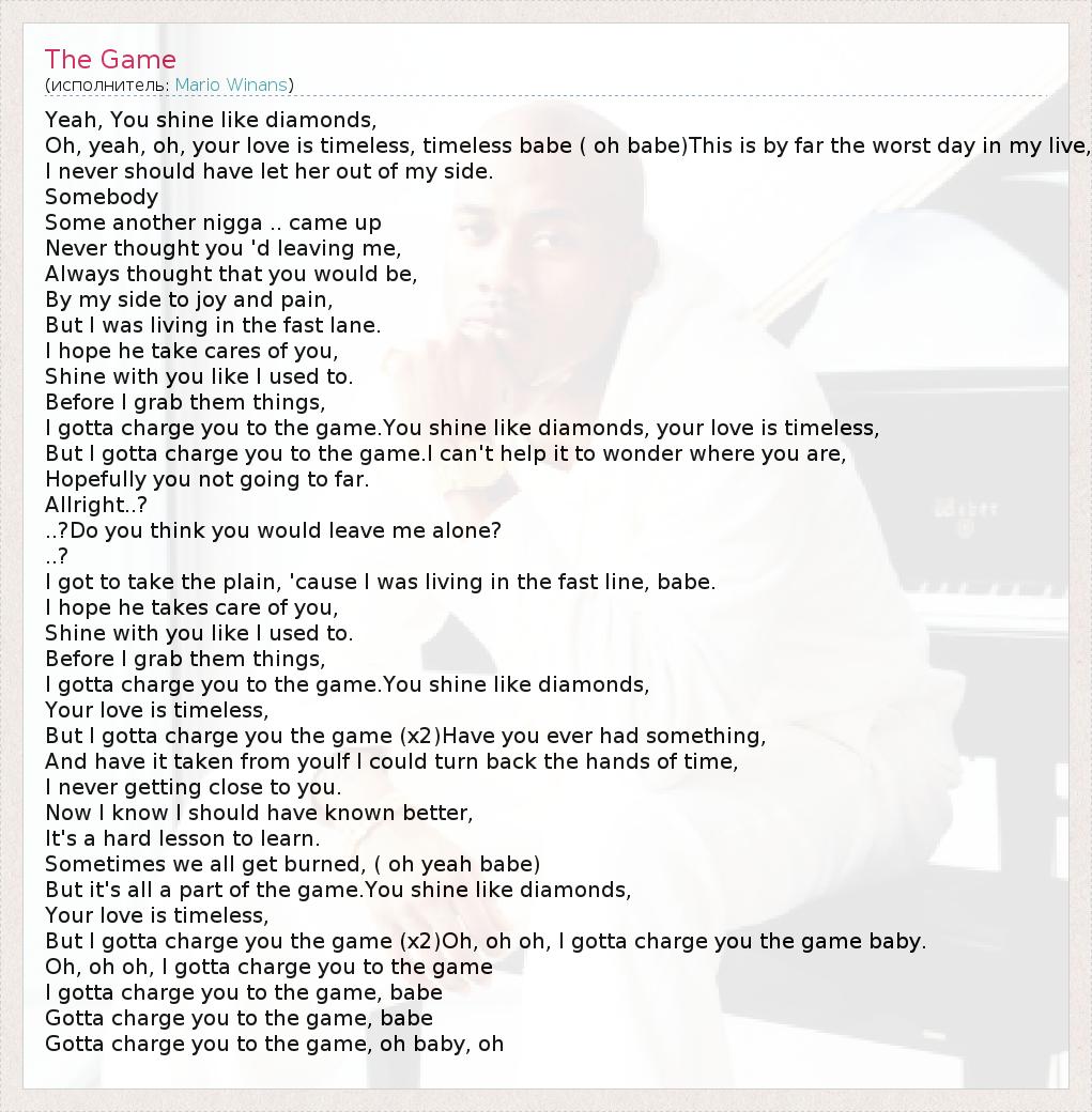 I gotta charge you to the game.You shine like diamonds, your love is timeless,