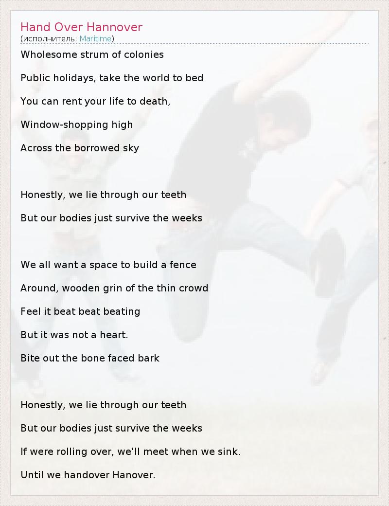 Wholesome strum of colonies Public holidays, take the world to bed You can rent your life to death, Window-shopping high Across the borrowed sky Honestly, we lie through our teeth But our bodies just survive the weeks We all want a space to build a fence Around, wooden grin of the thin crowd Feel it beat beat beating But it was not a heart. Bite out the bone faced bark Honestly, we lie through our teeth But our bodies just survive the weeks If were rolling over, we'll meet when we sink. Until we handover Hanover.