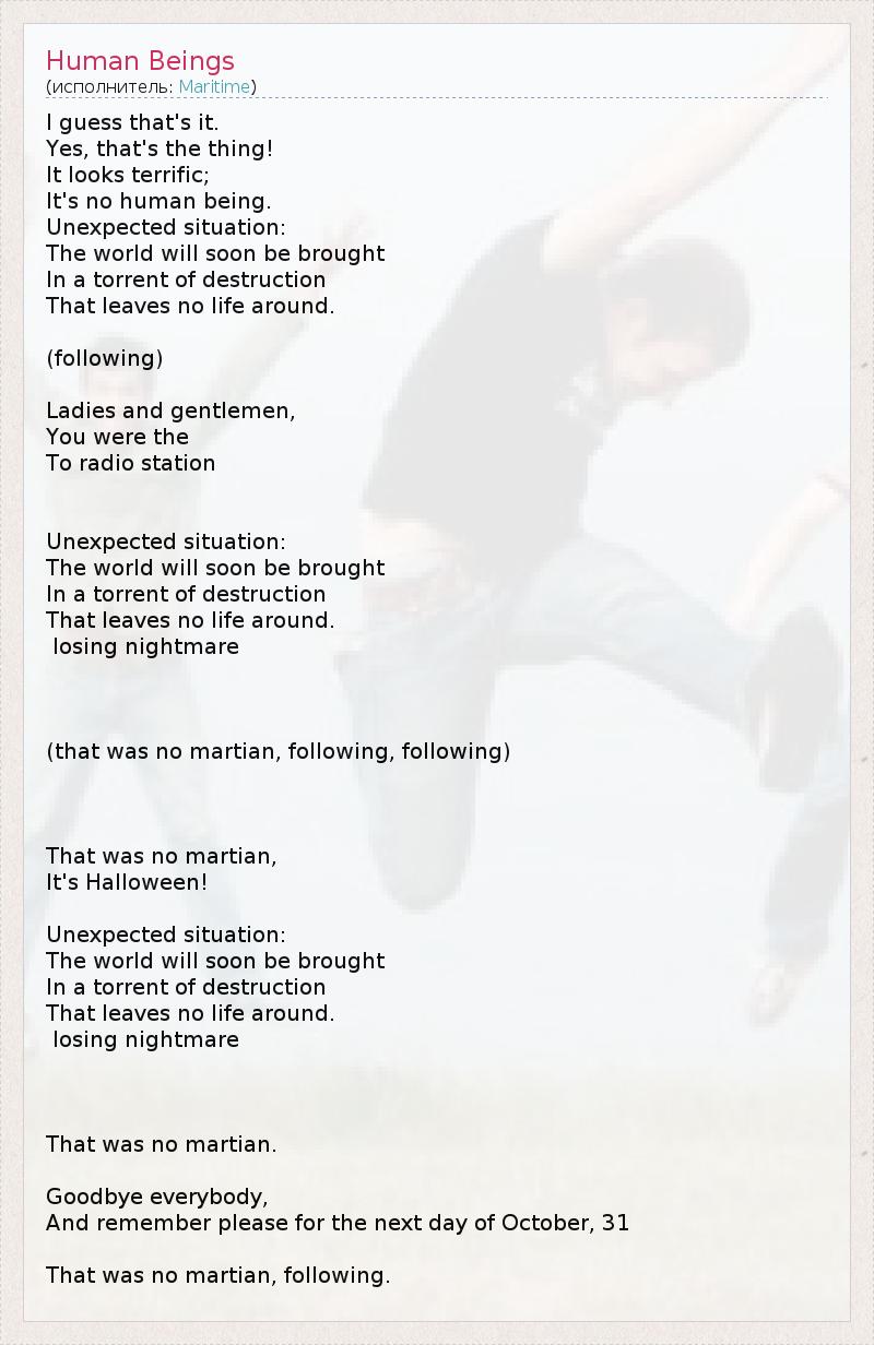 I guess that's it. Yes, that's the thing! It looks terrific; It's no human being. Unexpected situation: The world will soon be brought In a torrent of destruction That leaves no life around. (following) Ladies and gentlemen, You were the To radio station Unexpected situation: The world will soon be brought In a torrent of destruction That leaves no life around. losing nightmare (that was no martian, following, following) That was no martian, It's Halloween! Unexpected situation: The world will soon be brought In a torrent of destruction That leaves no life around. losing nightmare That was no martian. Goodbye everybody, And remember please for the next day of October, 31 That was no martian, following.