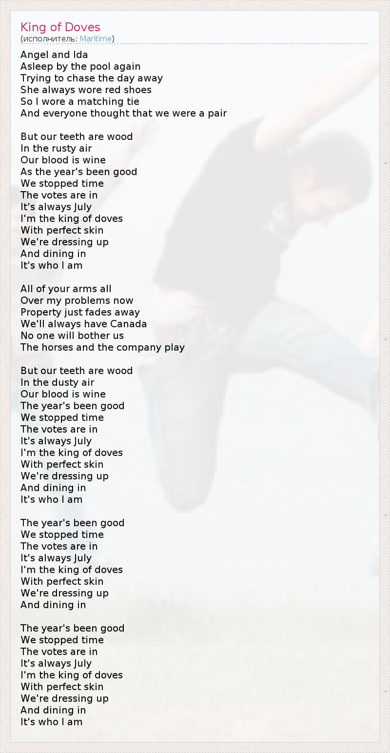 Angel and Ida Asleep by the pool again Trying to chase the day away She always wore red shoes So I wore a matching tie And everyone thought that we were a pair But our teeth are wood In the rusty air Our blood is wine As the year's been good We stopped time The votes are in It's always July I'm the king of doves With perfect skin We're dressing up And dining in It's who I am All of your arms all Over my problems now Property just fades away We'll always have Canada No one will bother us The horses and the company play But our teeth are wood In the dusty air Our blood is wine The year's been good We stopped time The votes are in It's always July I'm the king of doves With perfect skin We're dressing up And dining in It's who I am The year's been good We stopped time The votes are in It's always July I'm the king of doves With perfect skin We're dressing up And dining in The year's been good We stopped time The votes are in It's always July I'm the king of doves With perfect skin We're dressing up And dining in It's who I am