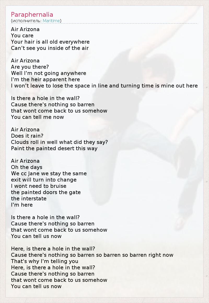 Air Arizona You care Your hair is all old everywhere Can't see you inside of the air Air Arizona Are you there? Well I'm not going anywhere I'm the heir apparent here I won't leave to lose the space in line and turning time is mine out here Is there a hole in the wall? Cause there's nothing so barren that wont come back to us somehow You can tell me now Air Arizona Does it rain? Clouds roll in well what did they say? Paint the painted desert this way Air Arizona Oh the days We cc Jane we stay the same exit will turn into change I wont need to bruise the painted doors the gate the interstate I'm here Is there a hole in the wall? Cause there's nothing so barren that wont come back to us somehow You can tell us now Here, is there a hole in the wall? Cause there's nothing so barren so barren so barren right now That's why I'm telling you Here, is there a hole in the wall? Cause there's nothing so barren that wont come back to us somehow You can tell us now