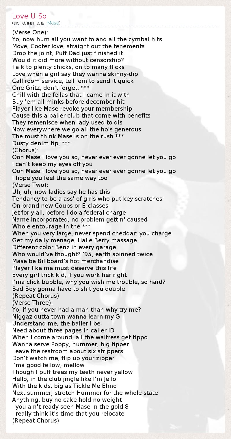 Это интересно:Реальное имя Mase`а – Mason Durrell Betha, он родился в Jacksonville, FL, 27 августа, 1977 года. Его семья переехала в суровый район Гарлем, когда ему было лишь 5 лет, но в 13 лет парнишку отправили обратно во Флориду, так как, по словам родителей, «он связался с ненужными людьми». Два года спустя он вновь вернулся в New York, и начал читать рэп, для того чтоб развлечь членов своей школьной баскетбольной команды. Мэйз,... продолжение