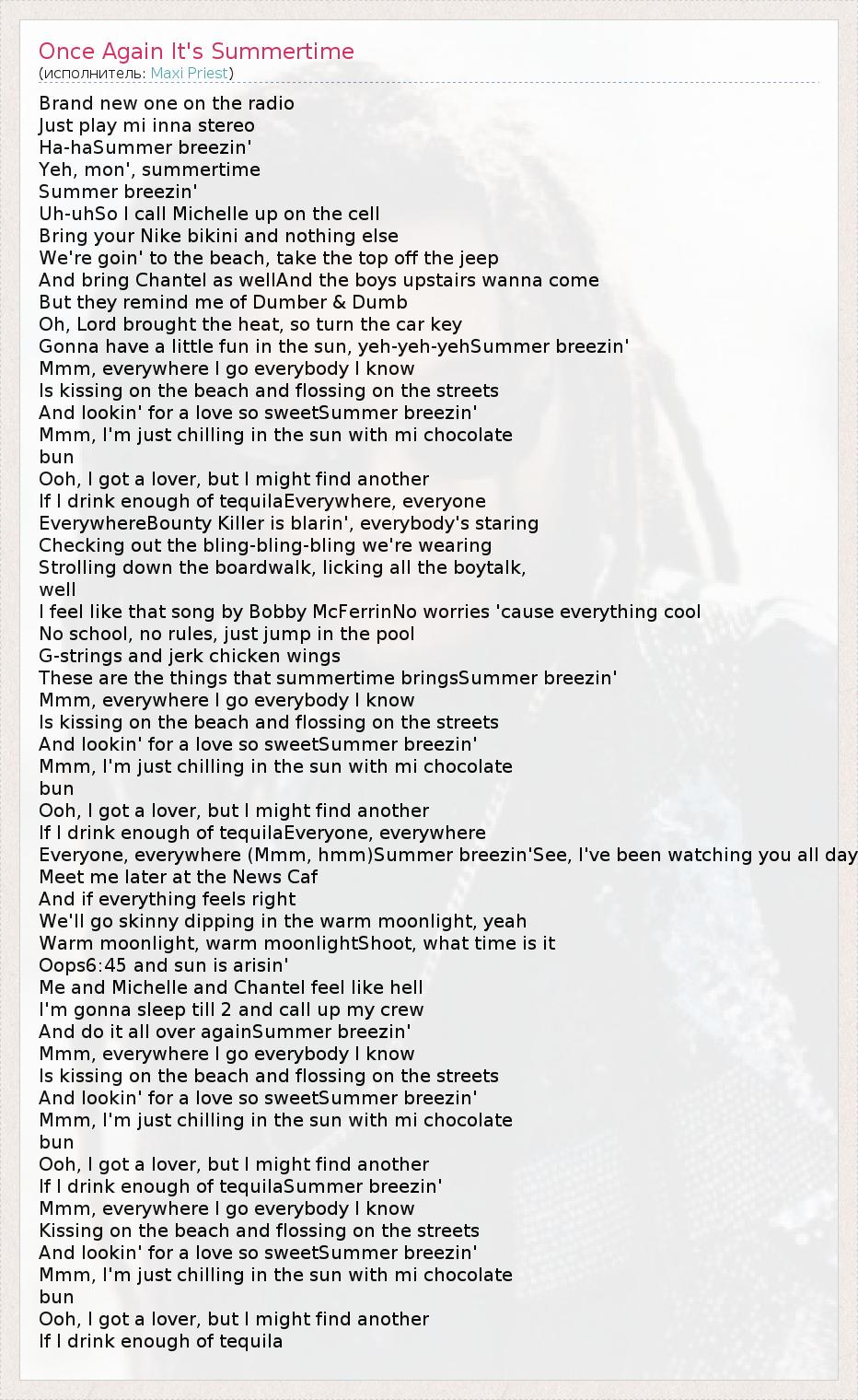 Brand new one on the radio Just play mi inna stereo Ha-haSummer breezin' Yeh, mon', summertime Summer breezin' Uh-uhSo I call Michelle up on the cell Bring your Nike bikini and nothing else We're goin' to the beach, take the top off the jeep And bring Chantel as wellAnd the boys upstairs wanna come But they remind me of Dumber & Dumb Oh, Lord brought the heat, so turn the car key Gonna have a little fun in the sun, yeh-yeh-yehSummer breezin' Mmm, everywhere I go everybody I know Is kissing on the beach and flossing on the streets And lookin' for a love so sweetSummer breezin' Mmm, I'm just chilling in the sun with mi chocolate bun Ooh, I got a lover, but I might find another If I drink enough of tequilaEverywhere, everyone EverywhereBounty Killer is blarin', everybody's staring Checking out the bling-bling-bling we're wearing Strolling down the boardwalk, licking all the boytalk, well I feel like that song by Bobby McFerrinNo worries 'cause everything cool No school, no rules, just jump in the pool G-strings and jerk chicken wings These are the things that summertime bringsSummer breezin' Mmm, everywhere I go everybody I know Is kissing on the beach and flossing on the streets And lookin' for a love so sweetSummer breezin' Mmm, I'm just chilling in the sun with mi chocolate bun Ooh, I got a lover, but I might find another If I drink enough of tequilaEveryone, everywhere Everyone, everywhere (Mmm, hmm)Summer breezin'See, I've been watching you all day Meet me later at the News Caf And if everything feels right We'll go skinny dipping in the warm moonlight, yeah Warm moonlight, warm moonlightShoot, what time is it Oops6:45 and sun is arisin' Me and Michelle and Chantel feel like hell I'm gonna sleep till 2 and call up my crew And do it all over againSummer breezin' Mmm, everywhere I go everybody I know Is kissing on the beach and flossing on the streets And lookin' for a love so sweetSummer breezin' Mmm, I'm just chilling in the sun with mi chocolate bun Ooh, I got a lover, but I might find another If I drink enough of tequilaSummer breezin' Mmm, everywhere I go everybody I know Kissing on the beach and flossing on the streets And lookin' for a love so sweetSummer breezin' Mmm, I'm just chilling in the sun with mi chocolate bun Ooh, I got a lover, but I might find another If I drink enough of tequila