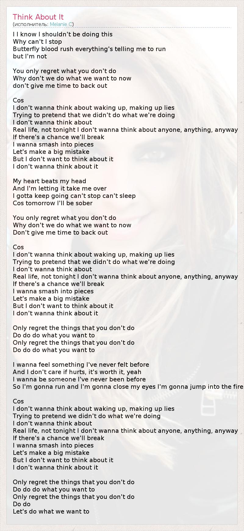 I I know I shouldn't be doing this Why can't I stop Butterfly blood rush everything's telling me to run but I'm not You only regret what you don't do Why don't we do what we want to now don't give me time to back out Cos I don't wanna think about waking up, making up lies Trying to pretend that we didn't do what we're doing I don't wanna think about Real life, not tonight I don't wanna think about anyone, anything, anyway If there's a chance we'll break I wanna smash into pieces Let's make a big mistake But I don't want to think about it I don't wanna think about it My heart beats my head And I'm letting it take me over I gotta keep going can't stop can't sleep Cos tomorrow I'll be sober You only regret what you don't do Why don't we do what we want to now Don't give me time to back out Cos I don't wanna think about waking up, making up lies Trying to pretend that we didn't do what we're doing I don't wanna think about Real life, not tonight I don't wanna think about anyone, anything, anyway If there's a chance we'll break I wanna smash into pieces Let's make a big mistake But I don't want to think about it I don't wanna think about it Only regret the things that you don't do Do do do what you want to Only regret the things that you don't do Do do do what you want to I wanna feel something I've never felt before And I don't care if hurts, it's worth it, yeah I wanna be someone I've never been before So I'm gonna run and I'm gonna close my eyes I'm gonna jump into the fire Cos I don't wanna think about waking up, making up lies Trying to pretend we didn't do what we're doing I don't wanna think about Real life, not tonight I don't wanna think about anyone, anything, anyway If there's a chance we'll break I wanna smash into pieces Let's make a big mistake But I don't want to think about it I don't wanna think about it Only regret the things that you don't do Do do do what you want to Only regret the things that you don't do Do do Let's do what we want to