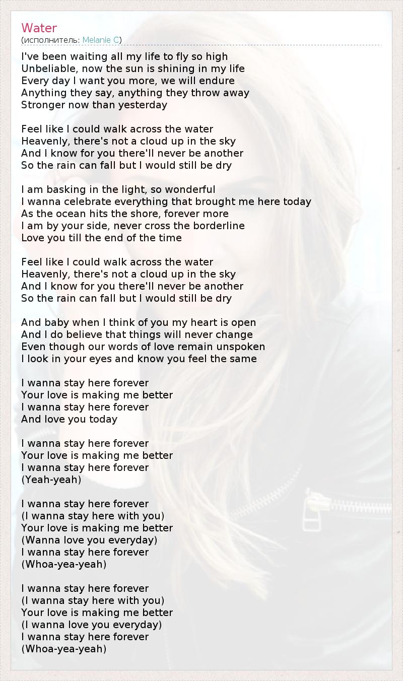 I've been waiting all my life to fly so high Unbeliable, now the sun is shining in my life Every day I want you more, we will endure Anything they say, anything they throw away Stronger now than yesterday Feel like I could walk across the water Heavenly, there's not a cloud up in the sky And I know for you there'll never be another So the rain can fall but I would still be dry I am basking in the light, so wonderful I wanna celebrate everything that brought me here today As the ocean hits the shore, forever more I am by your side, never cross the borderline Love you till the end of the time Feel like I could walk across the water Heavenly, there's not a cloud up in the sky And I know for you there'll never be another So the rain can fall but I would still be dry And baby when I think of you my heart is open And I do believe that things will never change Even though our words of love remain unspoken I look in your eyes and know you feel the same I wanna stay here forever Your love is making me better I wanna stay here forever And love you today I wanna stay here forever Your love is making me better I wanna stay here forever (Yeah-yeah) I wanna stay here forever (I wanna stay here with you) Your love is making me better (Wanna love you everyday) I wanna stay here forever (Whoa-yea-yeah) I wanna stay here forever (I wanna stay here with you) Your love is making me better (I wanna love you everyday) I wanna stay here forever (Whoa-yea-yeah)