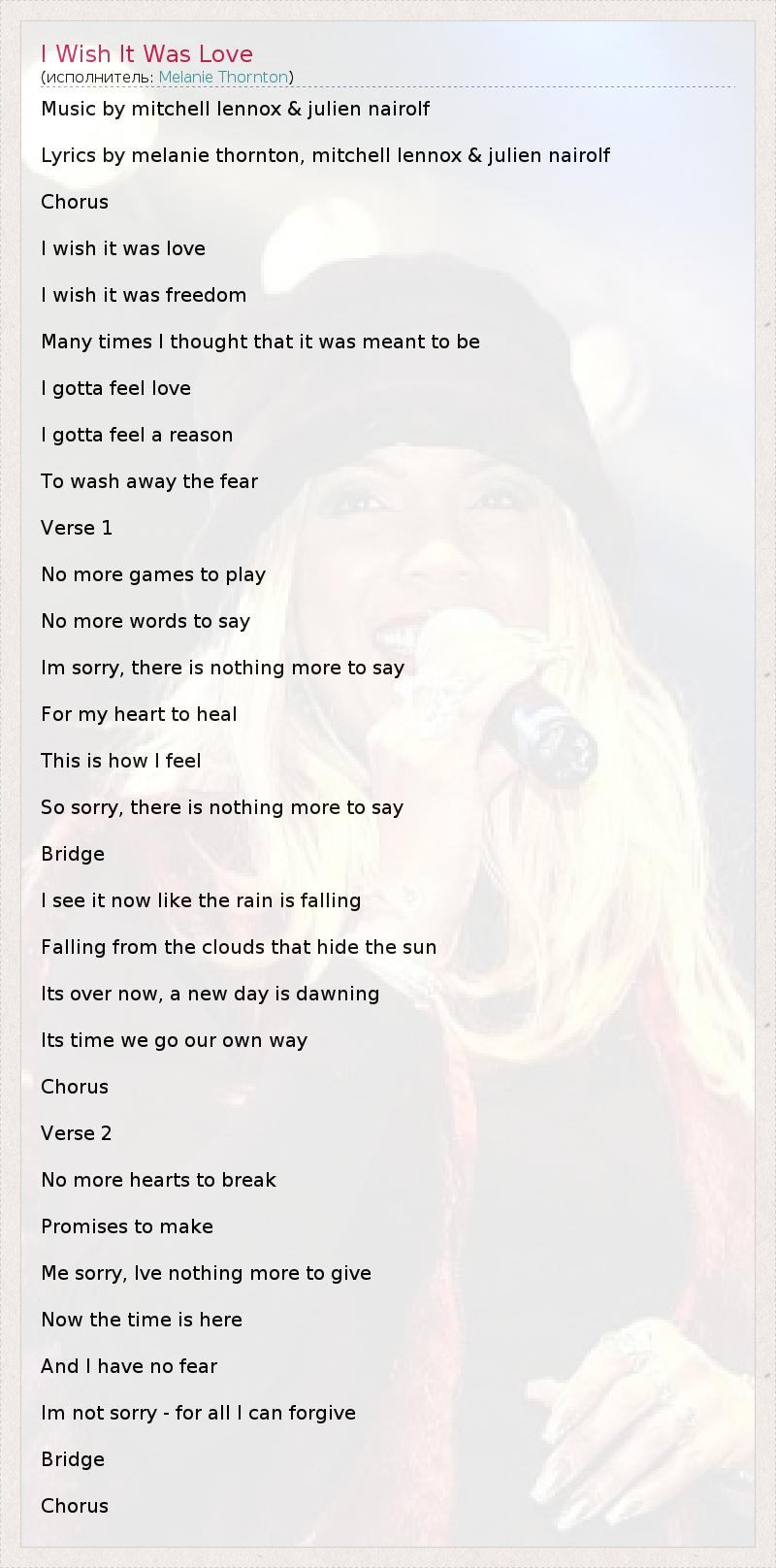 Music by mitchell lennox & julien nairolf Lyrics by melanie thornton, mitchell lennox & julien nairolf Chorus I wish it was love I wish it was freedom Many times I thought that it was meant to be I gotta feel love I gotta feel a reason To wash away the fear Verse 1 No more games to play No more words to say Im sorry, there is nothing more to say For my heart to heal This is how I feel So sorry, there is nothing more to say Bridge I see it now like the rain is falling Falling from the clouds that hide the sun Its over now, a new day is dawning Its time we go our own way Chorus Verse 2 No more hearts to break Promises to make Me sorry, Ive nothing more to give Now the time is here And I have no fear Im not sorry - for all I can forgive Bridge Chorus