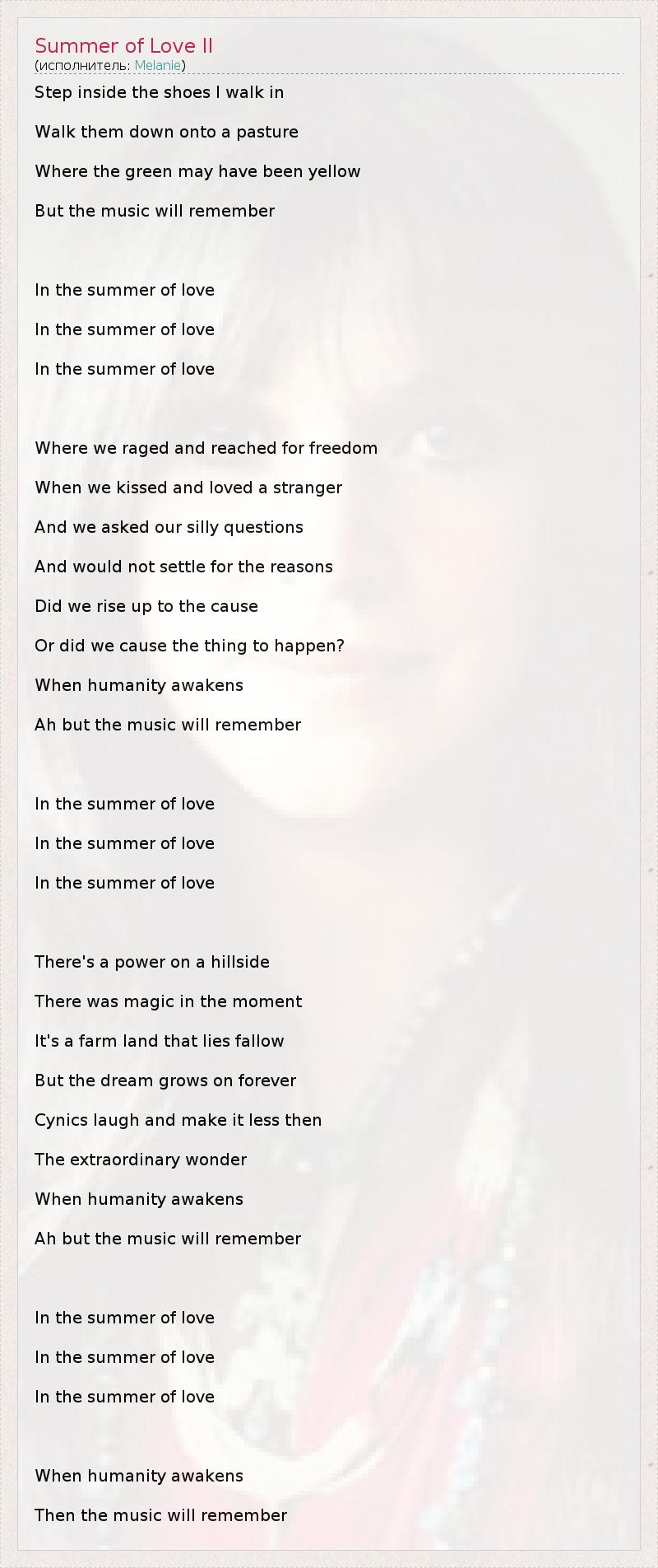 Step inside the shoes I walk in Walk them down onto a pasture Where the green may have been yellow But the music will remember In the summer of love In the summer of love In the summer of love Where we raged and reached for freedom When we kissed and loved a stranger And we asked our silly questions And would not settle for the reasons Did we rise up to the cause Or did we cause the thing to happen? When humanity awakens Ah but the music will remember In the summer of love In the summer of love In the summer of love There's a power on a hillside There was magic in the moment It's a farm land that lies fallow But the dream grows on forever Cynics laugh and make it less then The extraordinary wonder When humanity awakens Ah but the music will remember In the summer of love In the summer of love In the summer of love When humanity awakens Then the music will remember