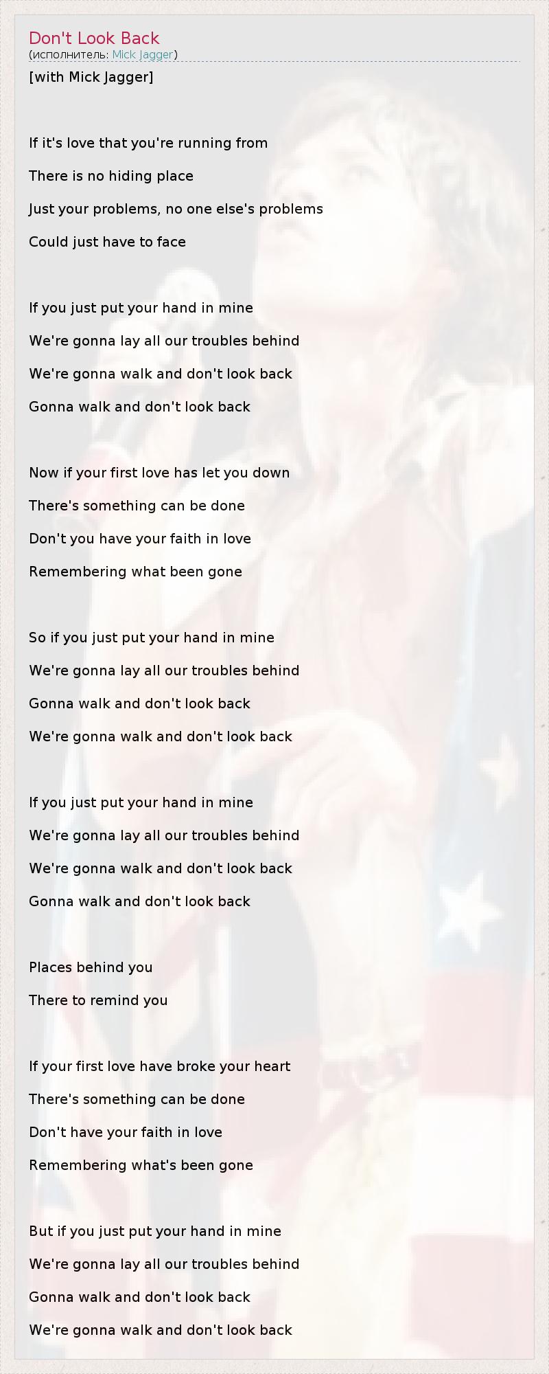 [with Mick Jagger] If it's love that you're running from There is no hiding place Just your problems, no one else's problems Could just have to face If you just put your hand in mine We're gonna lay all our troubles behind We're gonna walk and don't look back Gonna walk and don't look back Now if your first love has let you down There's something can be done Don't you have your faith in love Remembering what been gone So if you just put your hand in mine We're gonna lay all our troubles behind Gonna walk and don't look back We're gonna walk and don't look back If you just put your hand in mine We're gonna lay all our troubles behind We're gonna walk and don't look back Gonna walk and don't look back Places behind you There to remind you If your first love have broke your heart There's something can be done Don't have your faith in love Remembering what's been gone But if you just put your hand in mine We're gonna lay all our troubles behind Gonna walk and don't look back We're gonna walk and don't look back
