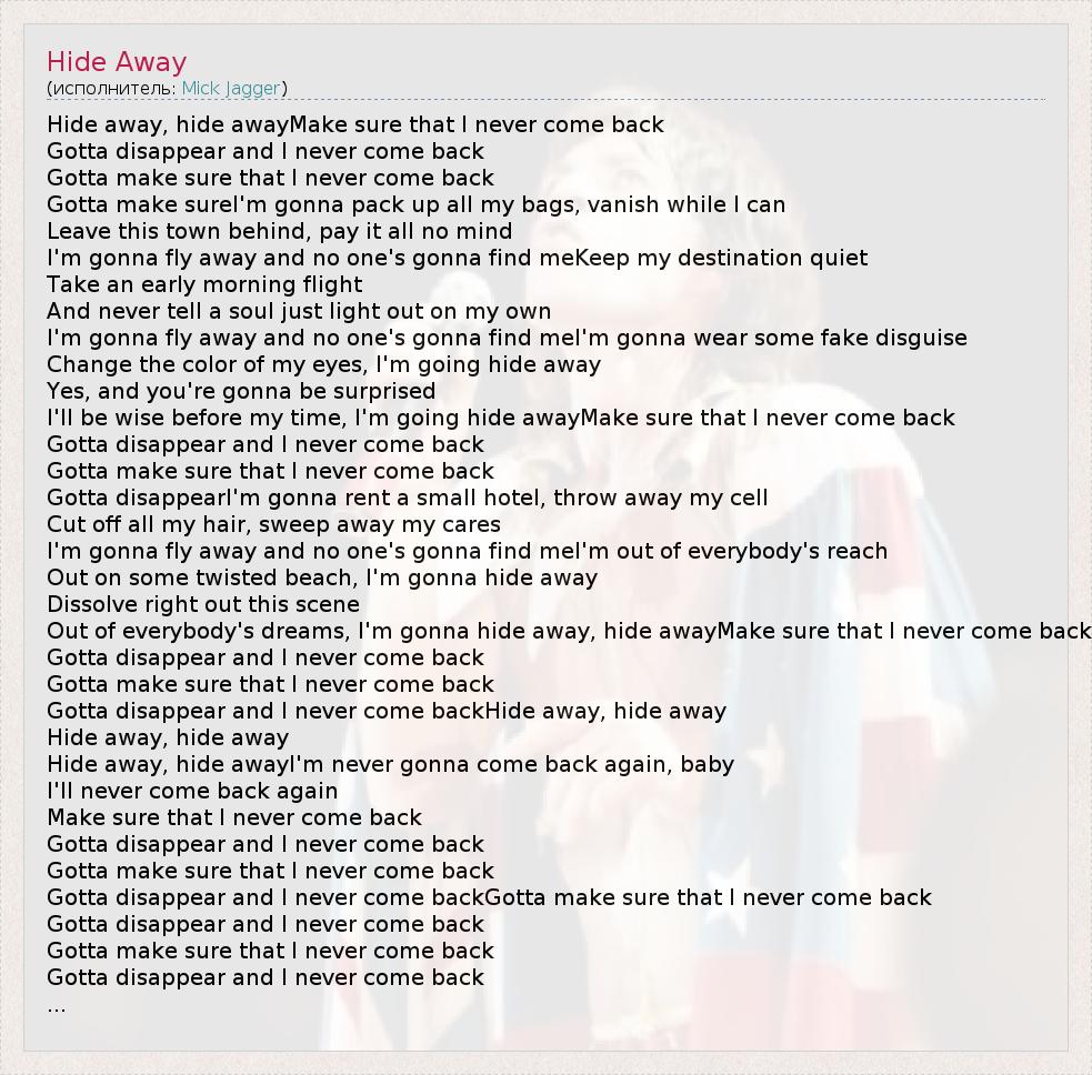 Out of everybody's dreams, I'm gonna hide away, hide awayMake sure that I never come back