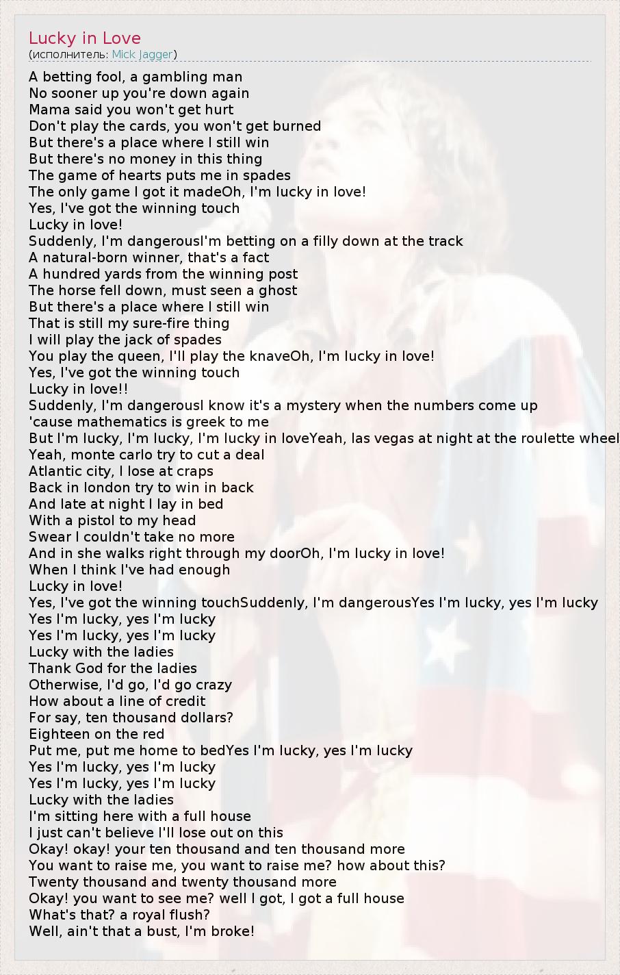But I'm lucky, I'm lucky, I'm lucky in loveYeah, las vegas at night at the roulette wheel