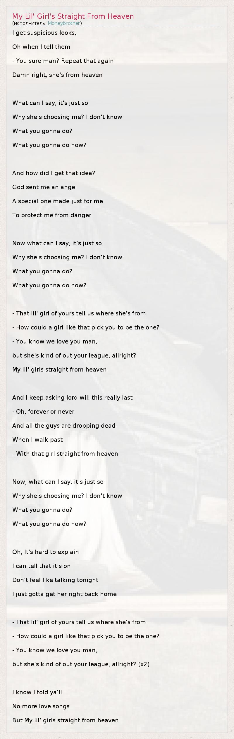 А как ты думаешь, о чем песня "My Lil' Girl's Straight From Heaven" ?