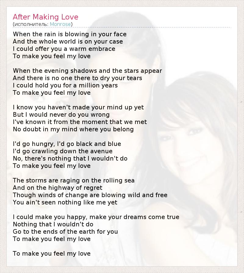When the rain is blowing in your face And the whole world is on your case I could offer you a warm embrace To make you feel my love When the evening shadows and the stars appear And there is no one there to dry your tears I could hold you for a million years To make you feel my love I know you haven't made your mind up yet But I would never do you wrong I've known it from the moment that we met No doubt in my mind where you belong I'd go hungry, I'd go black and blue I'd go crawling down the avenue No, there's nothing that I wouldn't do To make you feel my love The storms are raging on the rolling sea And on the highway of regret Though winds of change are blowing wild and free You ain't seen nothing like me yet I could make you happy, make your dreams come true Nothing that I wouldn't do Go to the ends of the earth for you To make you feel my love To make you feel my love