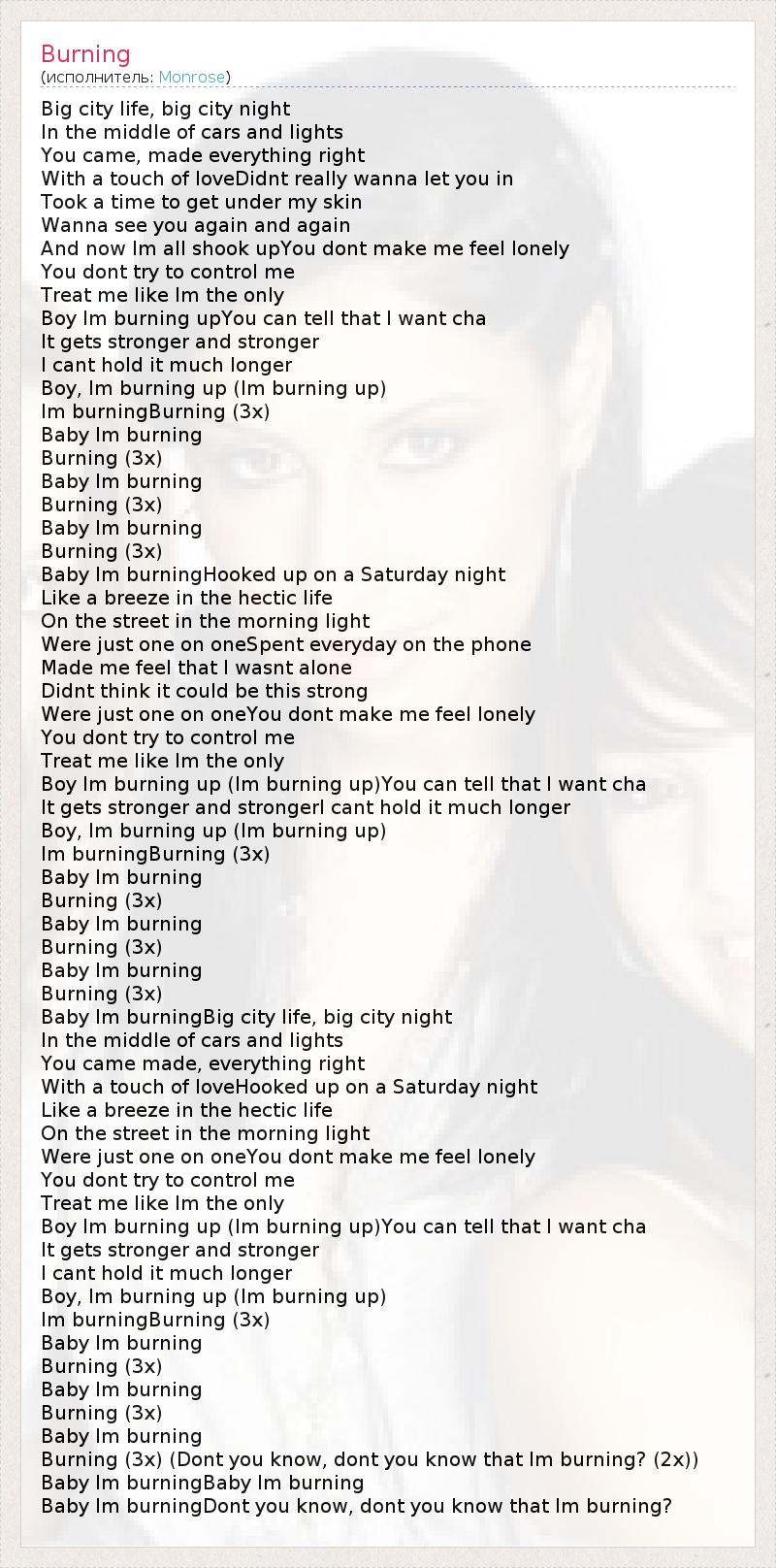 Big city life, big city night In the middle of cars and lights You came, made everything right With a touch of loveDidnt really wanna let you in Took a time to get under my skin Wanna see you again and again And now Im all shook upYou dont make me feel lonely You dont try to control me Treat me like Im the only Boy Im burning upYou can tell that I want cha It gets stronger and stronger I cant hold it much longer Boy, Im burning up (Im burning up) Im burningBurning (3x) Baby Im burning Burning (3x) Baby Im burning Burning (3x) Baby Im burning Burning (3x) Baby Im burningHooked up on a Saturday night Like a breeze in the hectic life On the street in the morning light Were just one on oneSpent everyday on the phone Made me feel that I wasnt alone Didnt think it could be this strong Were just one on oneYou dont make me feel lonely You dont try to control me Treat me like Im the only Boy Im burning up (Im burning up)You can tell that I want cha It gets stronger and strongerI cant hold it much longer Boy, Im burning up (Im burning up) Im burningBurning (3x) Baby Im burning Burning (3x) Baby Im burning Burning (3x) Baby Im burning Burning (3x) Baby Im burningBig city life, big city night In the middle of cars and lights You came made, everything right With a touch of loveHooked up on a Saturday night Like a breeze in the hectic life On the street in the morning light Were just one on oneYou dont make me feel lonely You dont try to control me Treat me like Im the only Boy Im burning up (Im burning up)You can tell that I want cha It gets stronger and stronger I cant hold it much longer Boy, Im burning up (Im burning up) Im burningBurning (3x) Baby Im burning Burning (3x) Baby Im burning Burning (3x) Baby Im burning Burning (3x) (Dont you know, dont you know that Im burning? (2x)) Baby Im burningBaby Im burning Baby Im burningDont you know, dont you know that Im burning?