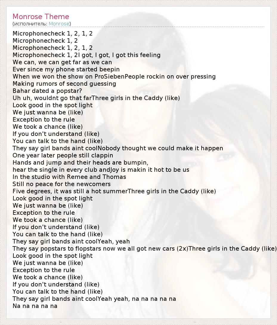 Microphonecheck 1, 2, 1, 2 Microphonecheck 1, 2 Microphonecheck 1, 2, 1, 2 Microphonecheck 1, 2I got, I got, I got this feeling We can, we can get far as we can Ever since my phone started beepin When we won the show on ProSiebenPeople rockin on over pressing Making rumors of second guessing Bahar dated a popstar? Uh uh, wouldnt go that farThree girls in the Caddy (like) Look good in the spot light We just wanna be (like) Exception to the rule We took a chance (like) If you don't understand (like) You can talk to the hand (like) They say girl bands aint coolNobody thought we could make it happen One year later people still clappin Hands and jump and their heads are bumpin, hear the single in every club andJoy is makin it hot to be us In the studio with Remee and Thomas Still no peace for the newcomers Five degrees, it was still a hot summerThree girls in the Caddy (like) Look good in the spot light We just wanna be (like) Exception to the rule We took a chance (like) If you don't understand (like) You can talk to the hand (like) They say girl bands aint coolYeah, yeah They say popstars to flopstars now we all got new cars (2x)Three girls in the Caddy (like) Look good in the spot light We just wanna be (like) Exception to the rule We took a chance (like) If you don't understand (like) You can talk to the hand (like) They say girl bands aint coolYeah yeah, na na na na na Na na na na na