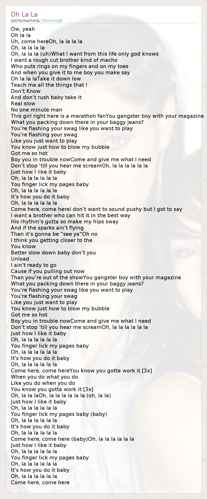 Ow, yeah Oh la la Uh, come hereOh, la la la la Oh, la la la la Oh, la la la (uh)What I want from this life only god knows I want a rough cut brother kind of macho Who puts rings on my fingers and on my toes And when you give it to me boy you make say Oh la la laTake it down low Teach me all the things that I Don't Know And don't rush baby take it Real slow No one minute man This girl right here is a marathon fanYou gangster boy with your magazine What you packing down there in your baggy jeans? You're flashing your swag like you want to play You're flashing your swag Like you just want to play You know just how to blow my bubble Got me so hot Boy you in trouble nowCome and give me what I need Don't stop 'till you hear me screamOh, la la la la la la Just how I like it baby Oh, la la la la la la You finger lick my pages baby Oh, la la la la la la It's how you do it baby Oh, la la la la la la Come here, come hereI don't want to sound pushy but I got to say I want a brother who can hit it in the best way His rhythm's gotta so make my hips sway And if the sparks ain't flying Than it's gonna be "see ya"Oh no I think you getting closer to the You know Better slow down baby don't you Unload I ain't ready to go Cause if you pulling out now Than you're out of the showYou gangster boy with your magazine What you packing down there in your baggy jeans? You're flashing your swag like you want to play You're flashing your swag Like you just want to play You know just how to blow my bubble Got me so hot Boy you in trouble nowCome and give me what I need Don't stop 'till you hear me screamOh, la la la la la la Just how I like it baby Oh, la la la la la la You finger lick my pages baby Oh, la la la la la la It's how you do it baby Oh, la la la la la la Come here, come hereYou know you gotta work it [3x] When you do what you do Like you do when you do You know you gotta work it [3x] Oh, la la laOh, la la la la la la (oh, la la) Just how I like it baby Oh, la la la la la la You finger lick my pages baby (baby) Oh, la la la la la la It's how you do it baby Oh, la la la la la la Come here, come here (baby)Oh, la la la la la la Just how I like it baby Oh, la la la la la la You finger lick my pages baby Oh, la la la la la la It's how you do it baby Oh, la la la la la la Come here, come here