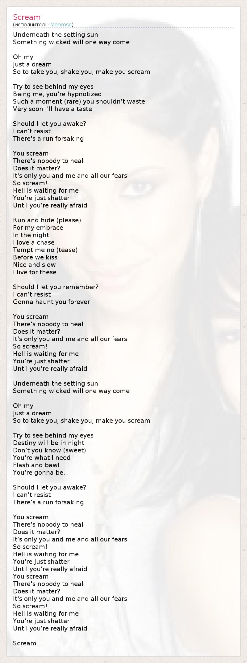 После захода солнца Что-то мерзкое ползёт сюда. Черт! Всего лишь сон, Итак, бойся, трясись, вопи! Попытайся заглянуть в мои глаза, Делай то, что я скажу, ты загипнотизирован, Такой момент (редкостный) ты не должен упустить, Очень скоро я войду во вкус Должна ли я позволить тебе очнуться? Я не могу сопротивляться, Это побег Ты вопишь! Никто не поможет, Это важно? Только ты и я и все наши страхи, Такой вопль! Меня ожидает ад, Ты ничтожество, Пока ты действительно напуган. Убеги и спрячься (пожалуйста) В моих объятьях, Ночью Я люблю погоню, Не соблазняй меня (не дразни), После того, как мы поцелуемся, Мила и тиха, Я так живу Должна ли я позволить тебе очнуться? Я не могу сопротивляться, Я буду вечно тебя мучать Ты вопишь! Никто не поможет, Это важно? Только ты и я и все наши страхи, Такой вопль! Меня ожидает ад, Ты ничтожество, Пока ты действительно напуган. После захода солнца Что-то мерзкое ползёт сюда Черт! Всего лишь сон, Итак, бойся, трясись, вопи Попытайся заглянуть в мои глаза, Рок управляет ночью, Разве ты не знаешь, (сладенький) Ты — то, что мне нужно, Внезапно убежать и громко звать на помощь, Ты собираешься так сделать... Должна ли я позволить тебе очнуться? Я не могу сопротивляться, Это побег Ты вопишь! Никто не поможет, Это важно? Только ты и я и все наши страхи, Такой вопль! Меня ожидает ад, Ты ничтожество, Пока ты действительно напуган. Ты вопишь! Никто не поможет, Это важно? Только ты и я и все наши страхи, Такой вопль! Меня ожидает ад, Ты ничтожество, Пока ты действительно напуган Вопль...